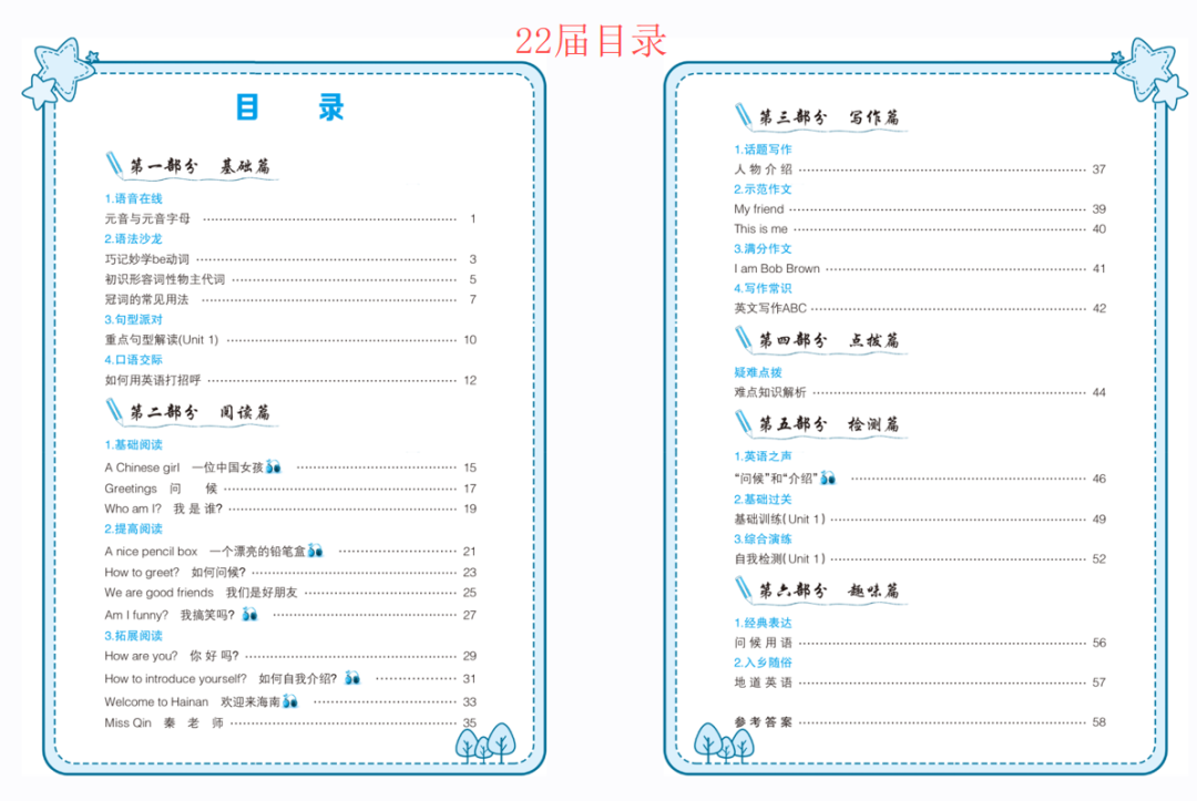 2022届《爱英语》是21届的升级版。有四大变化:第一,强化基础,将“基础篇”(主要指本阶段涉及的重点词汇、句型及语法)提到了最前面,它是阅读与写作的基础;第二,“阅读篇”,分层分级,有利于同一学生在不同阶段阅读,也有利于基础不一样的学生选择性阅读,这样能大大提高学生的阅读效率;第三,“写作篇”, 更接地气,内容更丰富,不仅有详细的写作指导步骤解说,还有写作模板,写作范文,名师点评等;第四,将原来的“演练篇”改为了“检测篇”,比以前更有利于学生在本阶段适时训练、检测自己对本阶段的基础知识及综合知识,更好了解自己对此阶段知识的掌握情况。