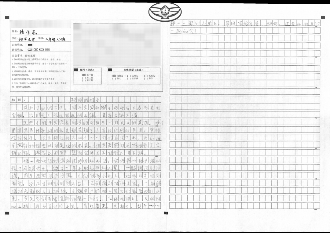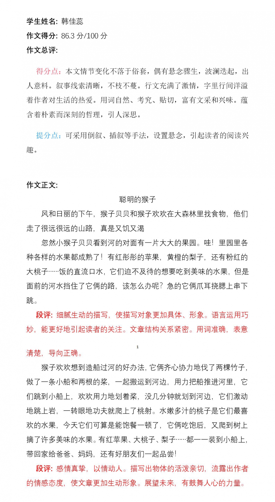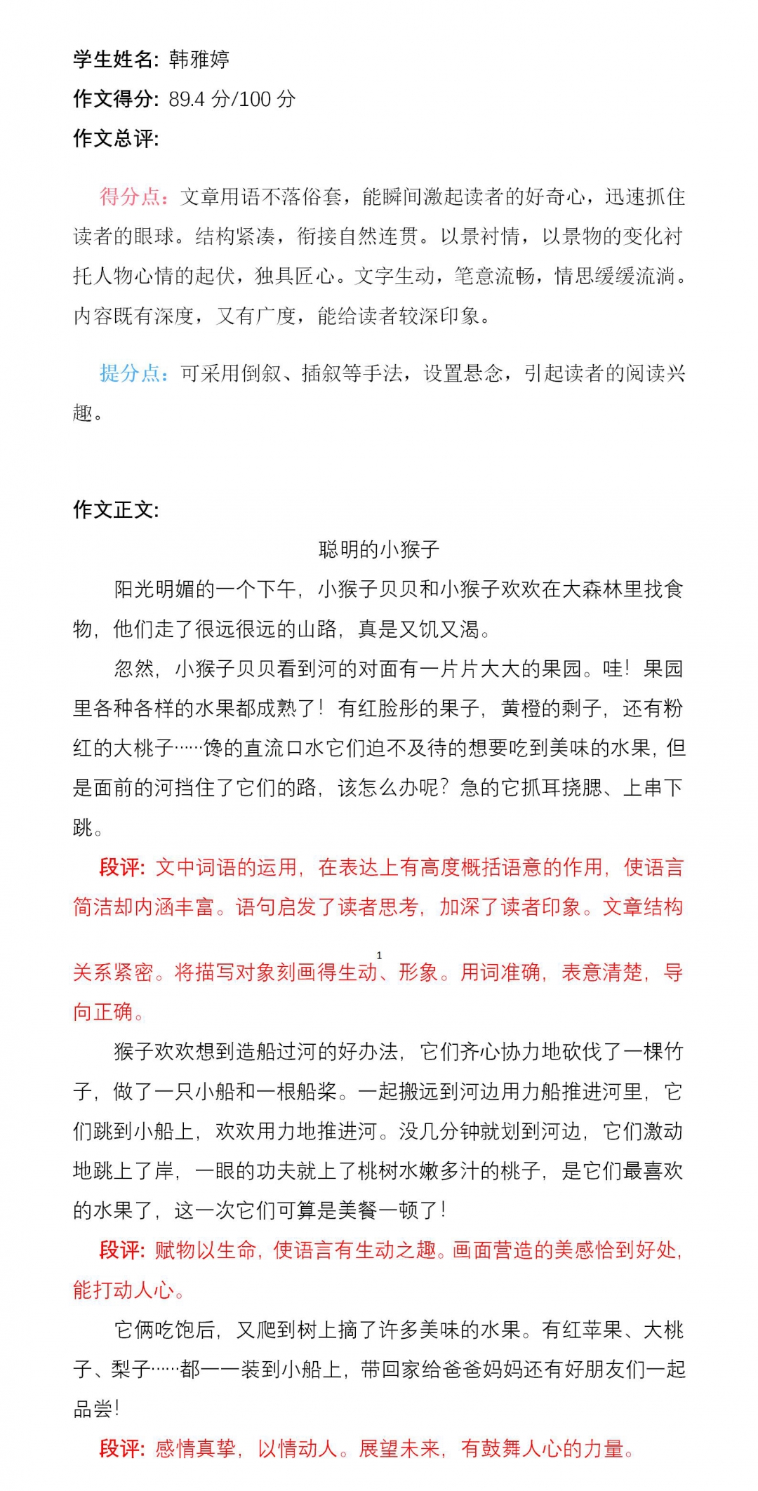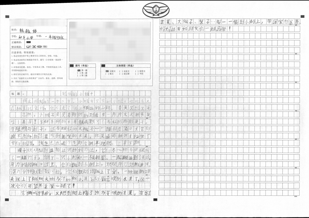 当孩子仔细审题,自己命名为《聪明的小猴子》,并抄写好初稿后,我和他一起品读,修饰语句,增加对描写对象的刻画,使得文章更为生动一些。孩子学习到作文中小猴子遇到问题不放弃,并想办法解决问题的精神和小猴子懂得感恩,乐与分享的良好品德。