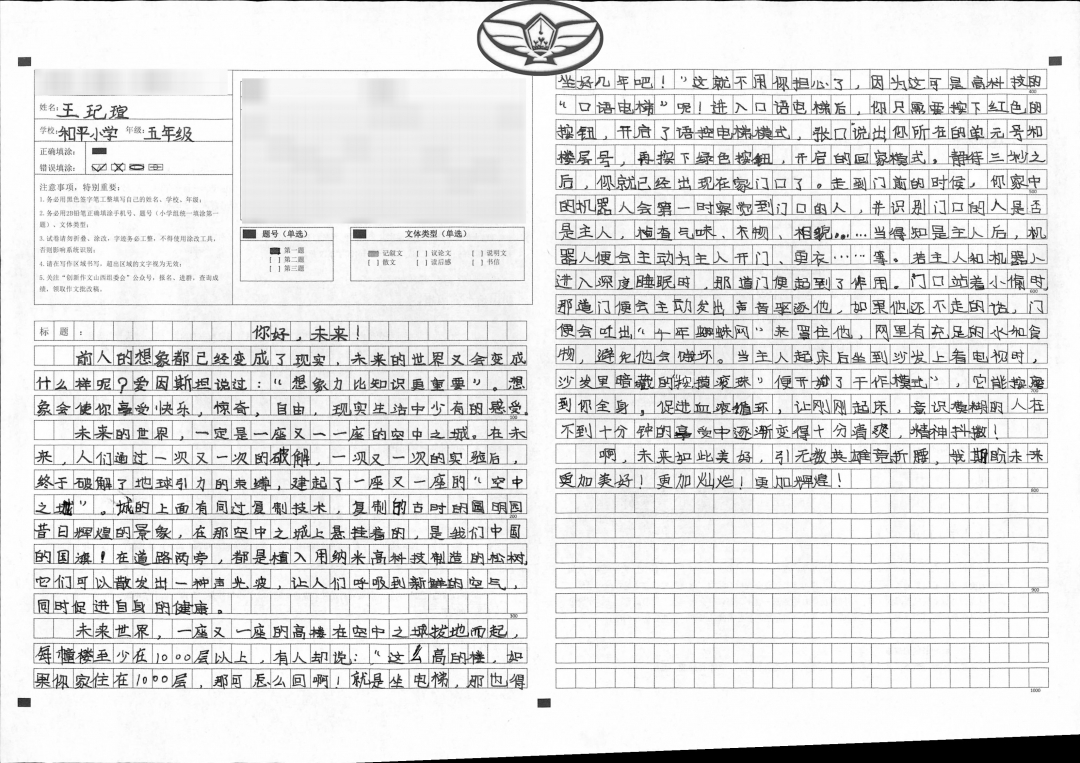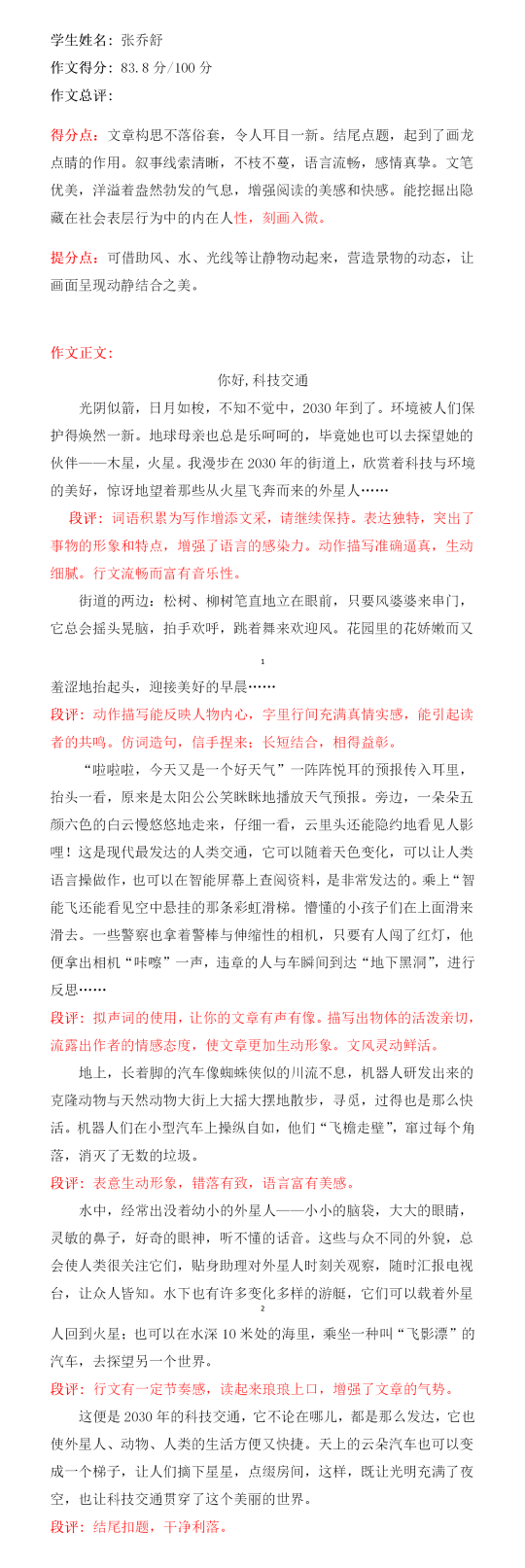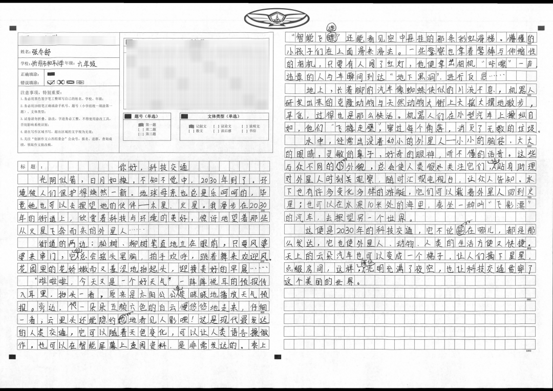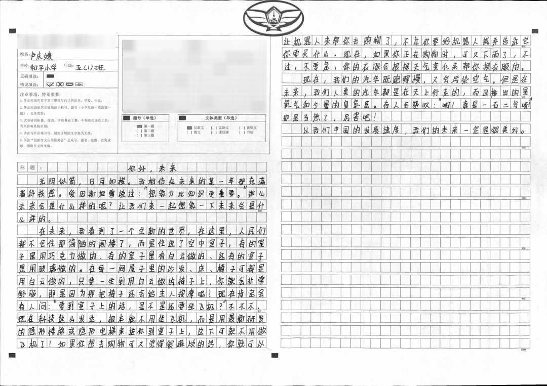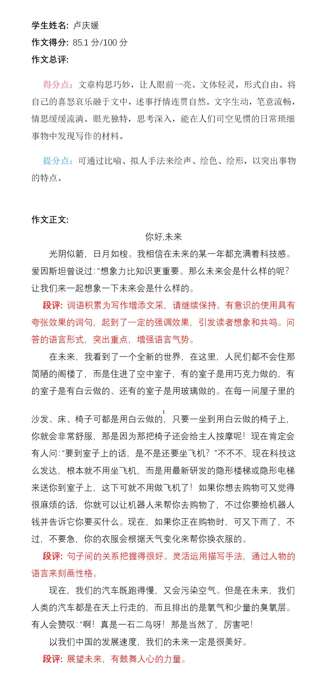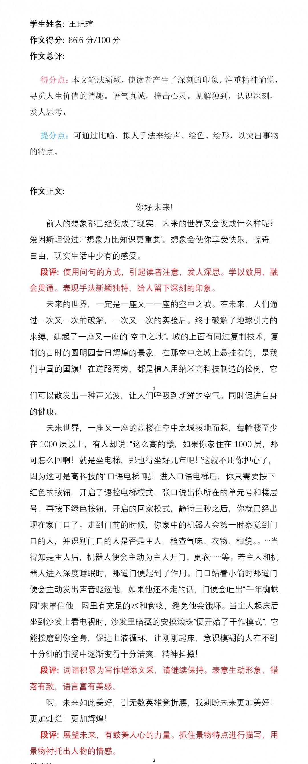 孩子,你能从想象中选出与题目有关的东西,选出素材,把想象与现实相结合,让读者随着你的思想进入21世纪的新未来。望你在以后得写作道路上继续大胆创新,更上一层楼。