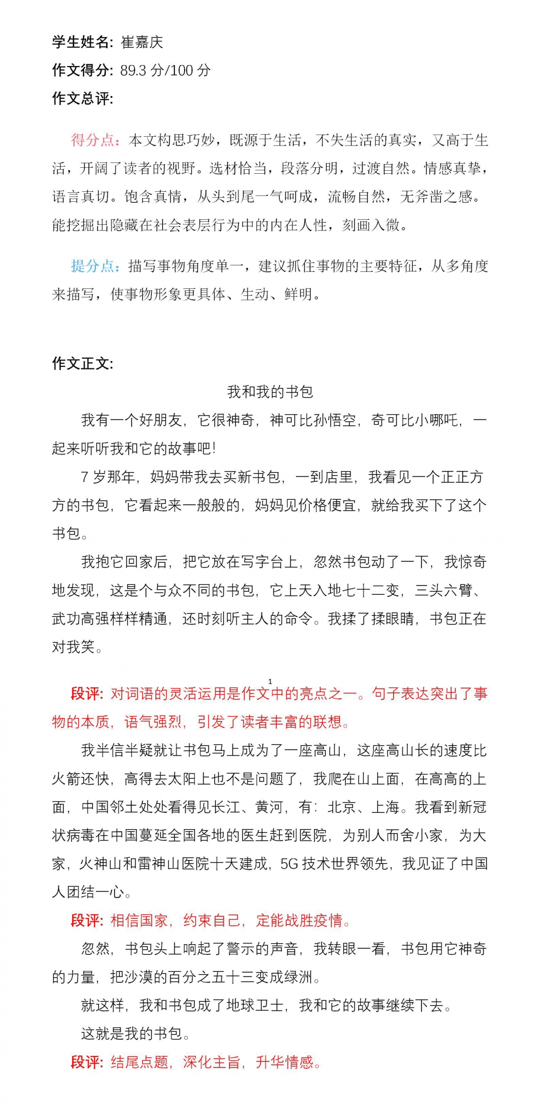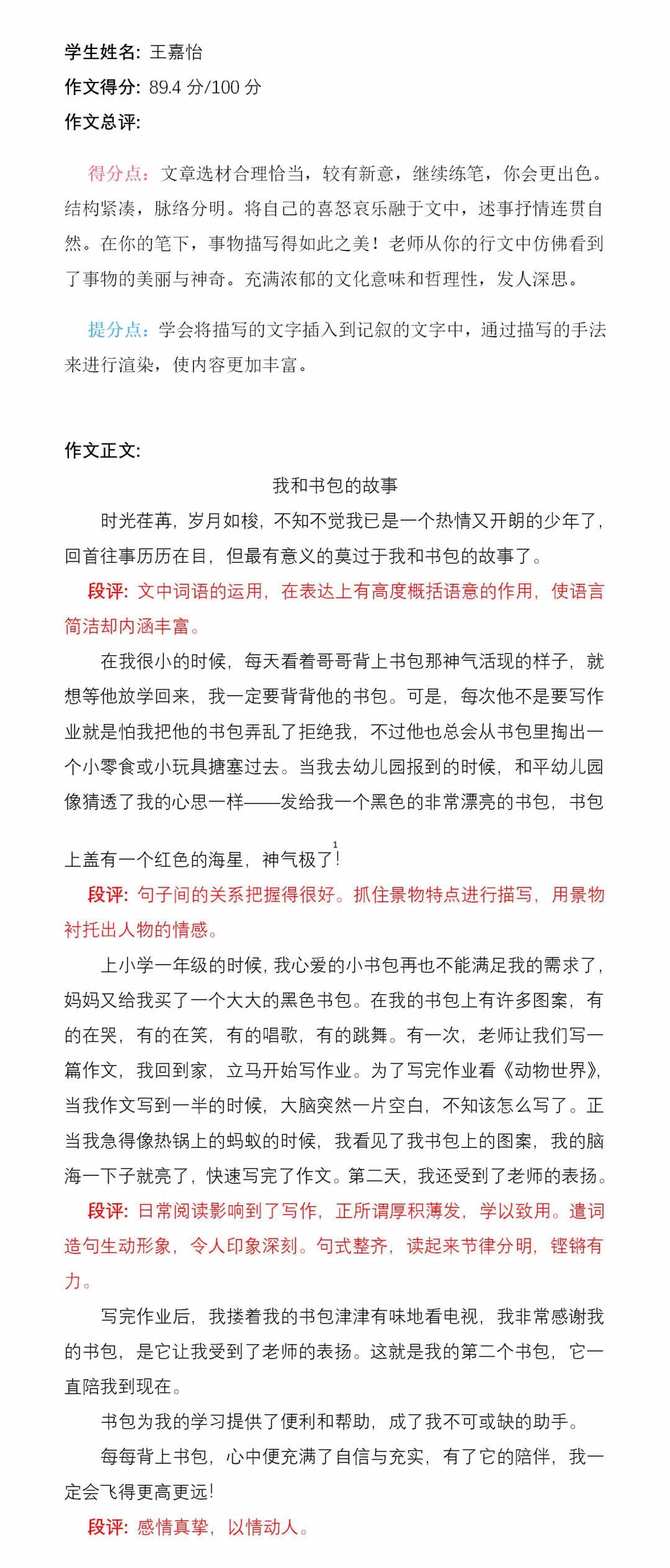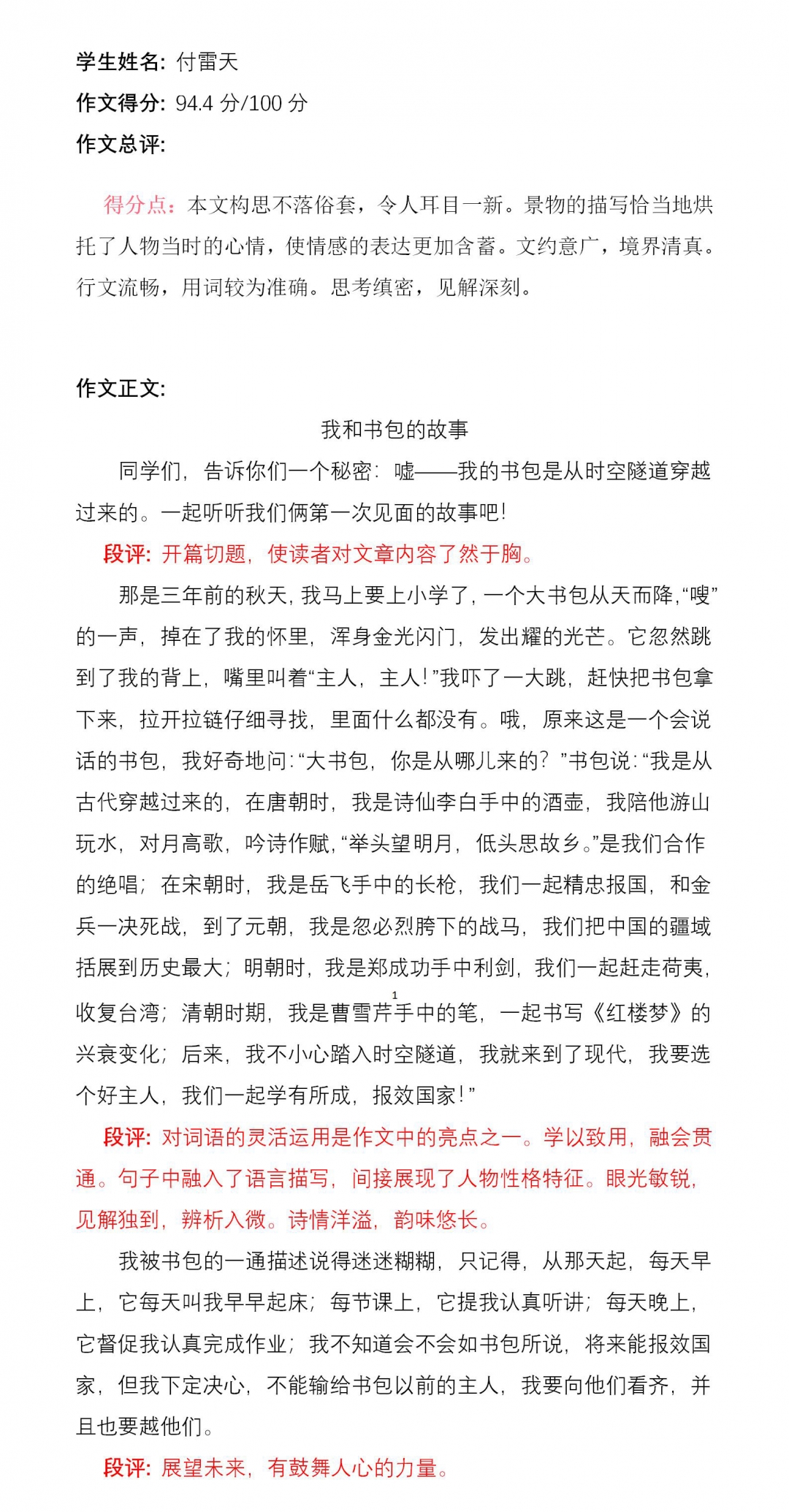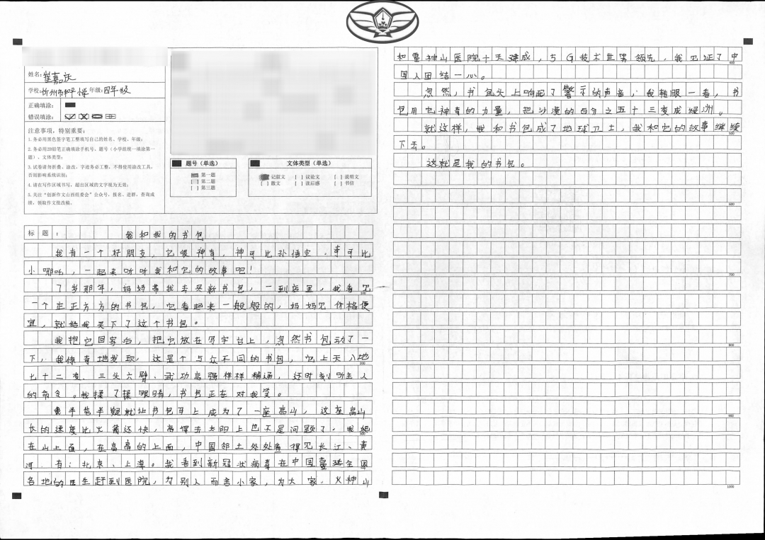 站在家长的角度看,把一个书包作为题材来写创新作文,真是无从下手。但孩子超越现实,大胆想象,写出了这么有意义的作文,真是令人欣喜。