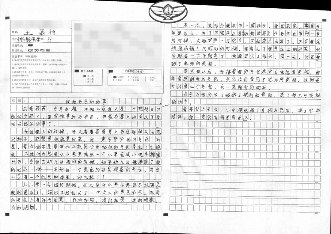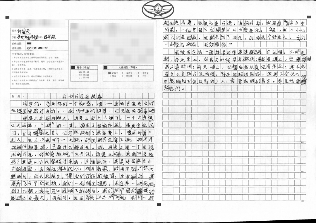 我提醒他,这次可是“创新作文”哦,孩子神秘一笑,说:“我的书包还会变身呢!”我以为他会写变身奥特曼、超级飞侠之类,没想到孩子提笔一气呵成,写了书包曾是李白的酒壶,岳飞的长枪,忽必烈的战马……穿越到现代寻找主人。真是让人出其不意,眼前一亮。