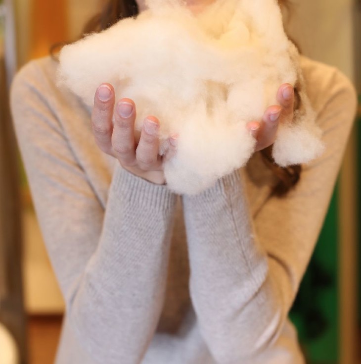 来自Sandriver 自有牧场的山羊绒,羊绒纤维卷曲数,卷曲率,卷曲回复率均较大。由这样的原绒做成的单品,柔软,细腻,手感丰满。