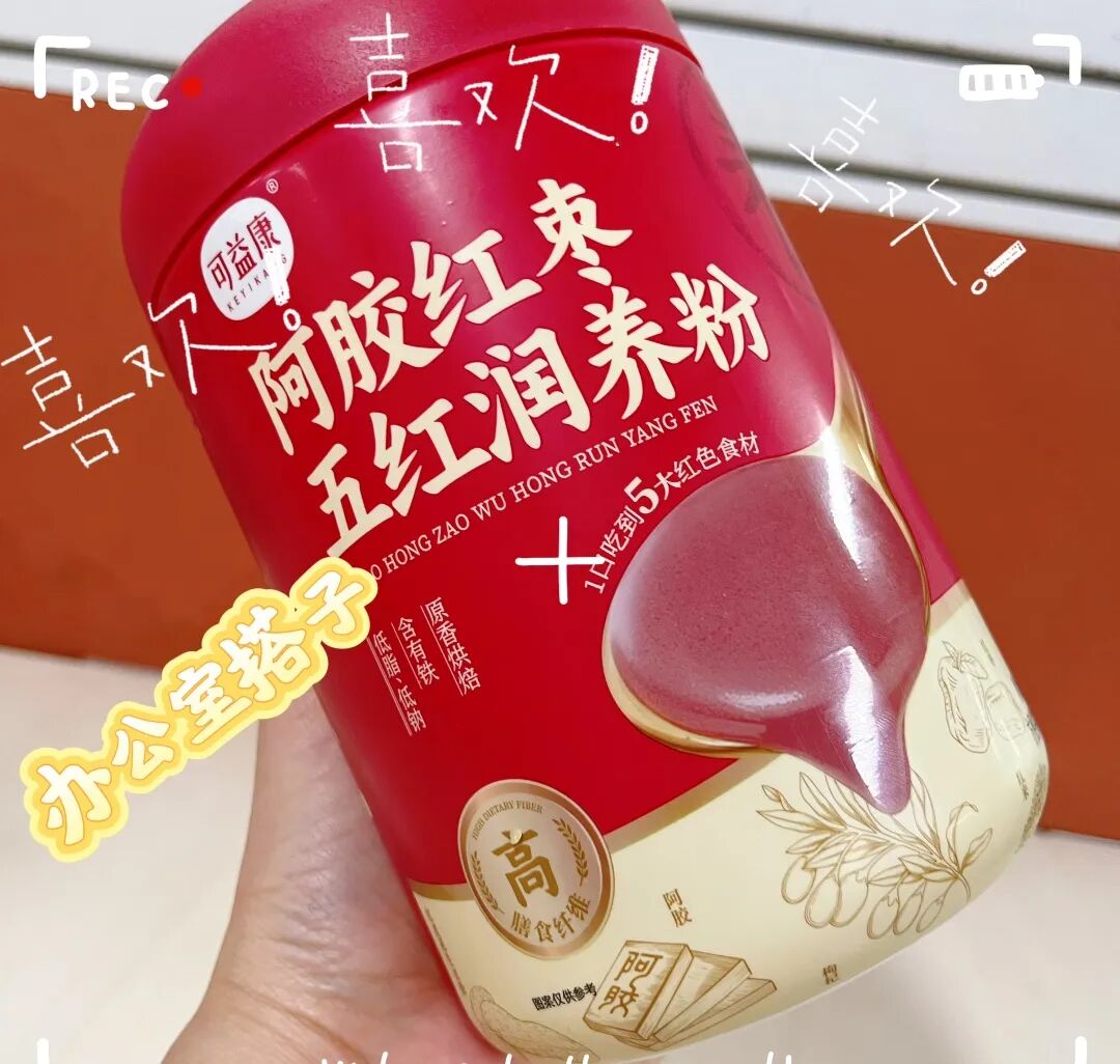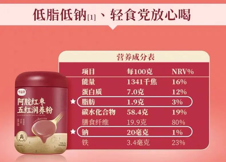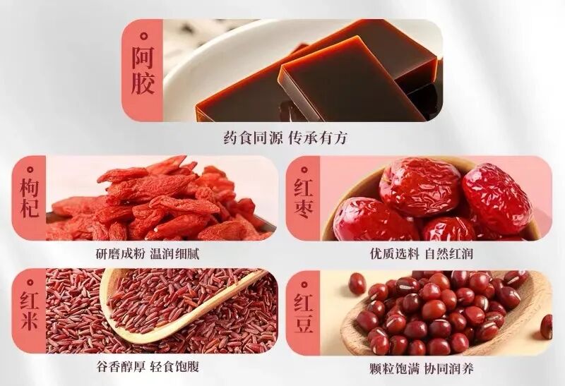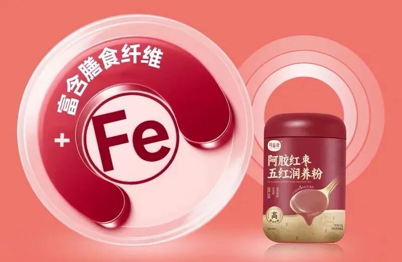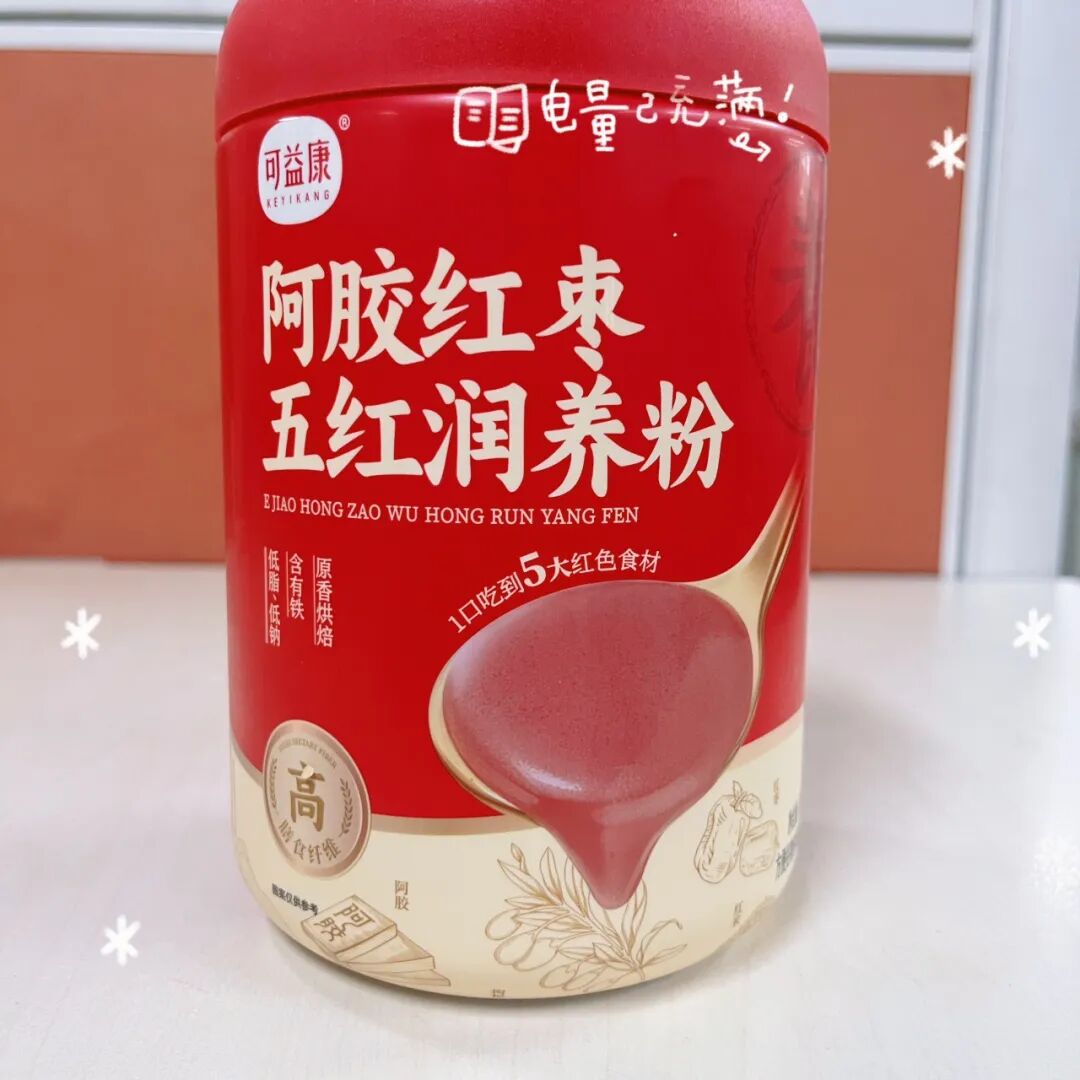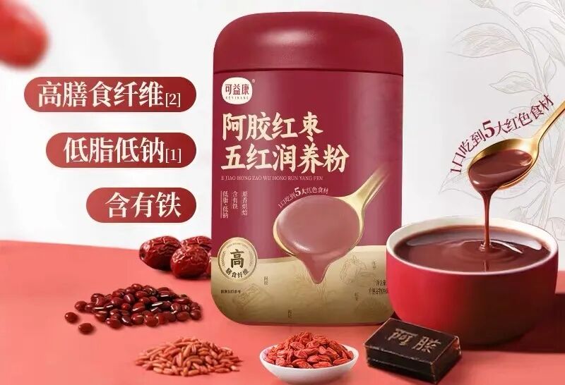 可益康阿胶红枣五红润养粉,集齐红米、红小豆、红枣圈、红枸杞粉、红皮花生衣粉五种红色食材,特别添加阿胶块、焦磷酸铁。