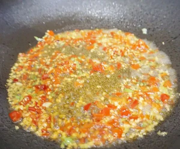 3、将剁碎的鱼泡椒和郫县豆瓣酱按1:1的比例混合好,放入葱姜汁中搅匀待用;