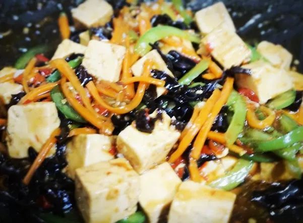 2、添1勺料酒,放入青红椒块、蔬菜丁,翻炒几下后,将豆腐,酱汁入锅,小火咕嘟2~3分钟;