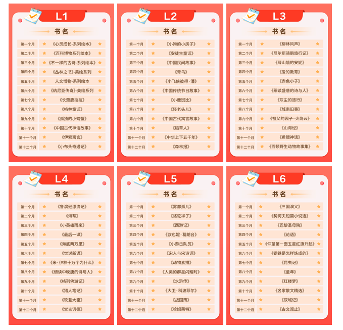 每个级别包含12本名著,本本都是精选无删减好书,全年12本大块头经典名篇名著,一年百万字以上优质阅读量。