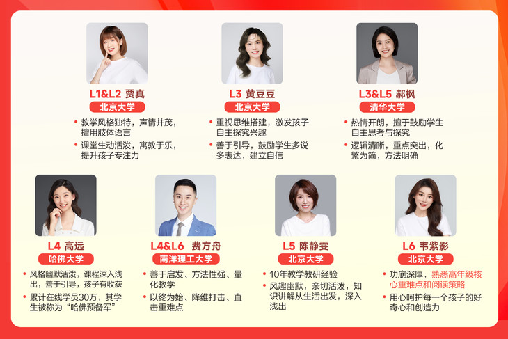 课程采用真人互动的技术,每周两节,一个月一本书,一二年级每次课30分钟(3-6年级40分钟),有多个时间段可选,老师都是北大哈佛毕业的原学而思明星讲师: