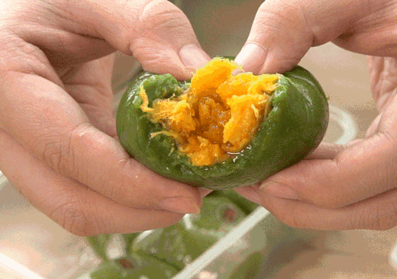 咸蛋黄肉松青团,翠绿裹着金黄边。看着就让人喜欢。