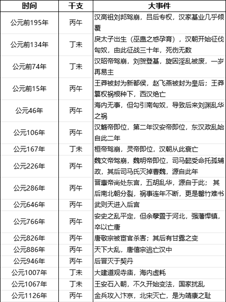 在横跨数千年的历史长河中,仅挑出少数几个发生了事情的丙午、丁未年作为论据,这种统计方式本身就不够严谨。为了得出更可靠的结论,唯有进行全面的统计。因此,小编将自秦朝以来所有的丙午、丁未年悉数罗列,以期获得一个更完整的图景。