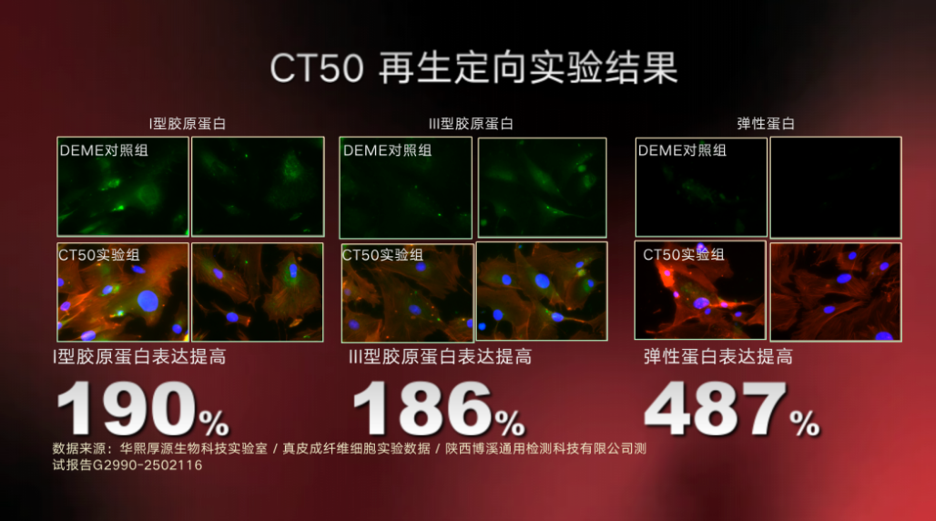 CT50可以使线粒体信号增强16倍ATP能量,提升27%弹性蛋白表达+479.7%I型胶原蛋白+164.6%III型胶原蛋白+184.3%