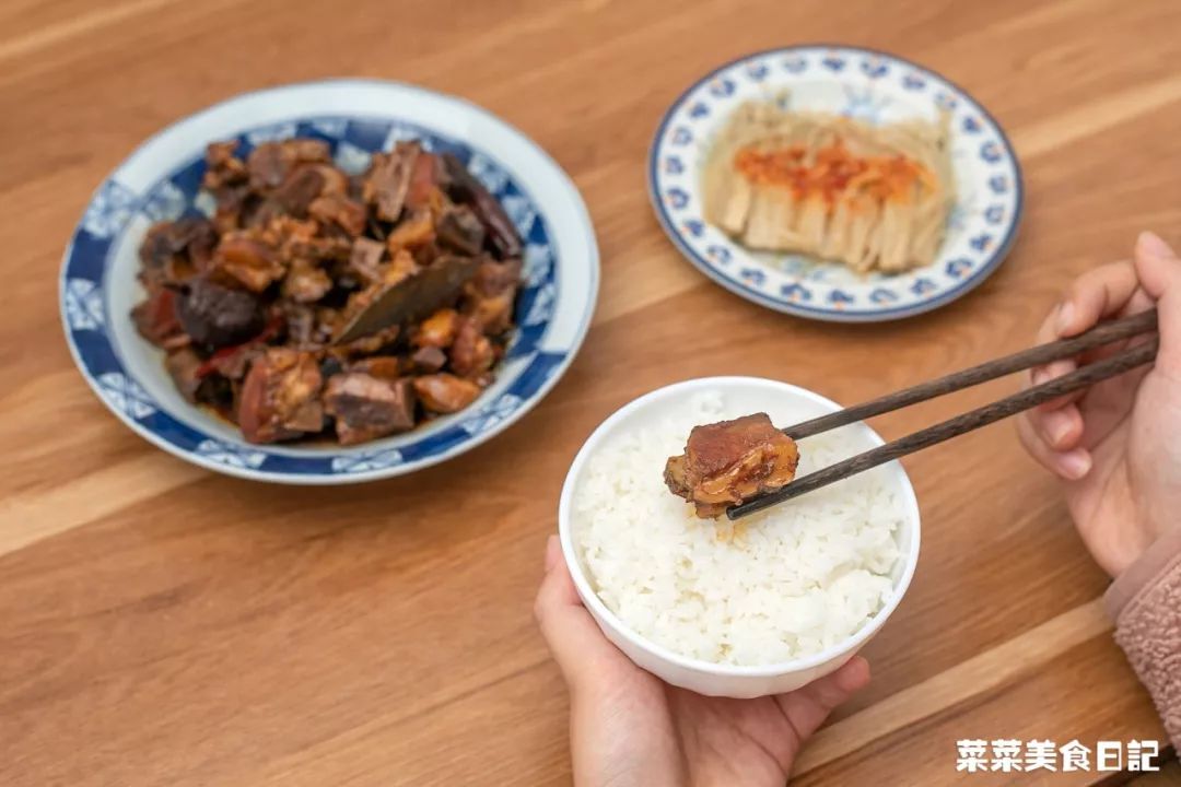 糯叽叽的红烧肉下饭,配上清爽的金针菇。