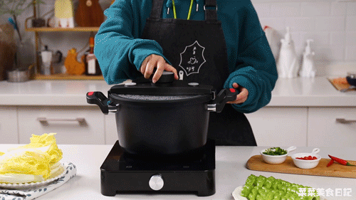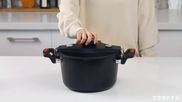 想要微压环境密闭炖煮时,只需要将旋钮拧至CLOSE,锁住锅盖。