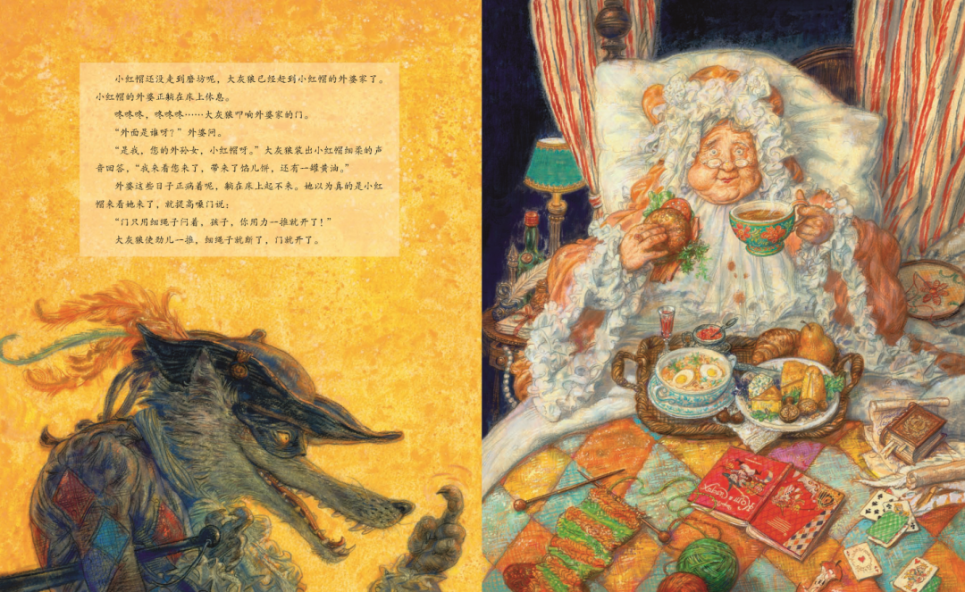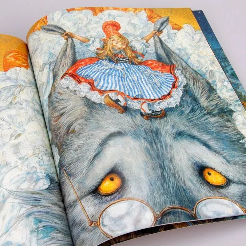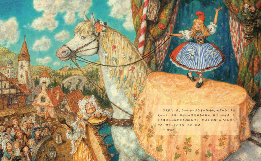 《小红帽》和《穿靴子的猫》画风相近,色彩绚丽。但安东版的《小红帽》,用舞台剧的形式来讲述这个故事,搭配造型夸张但表现写实的人物,简直不能再合适。