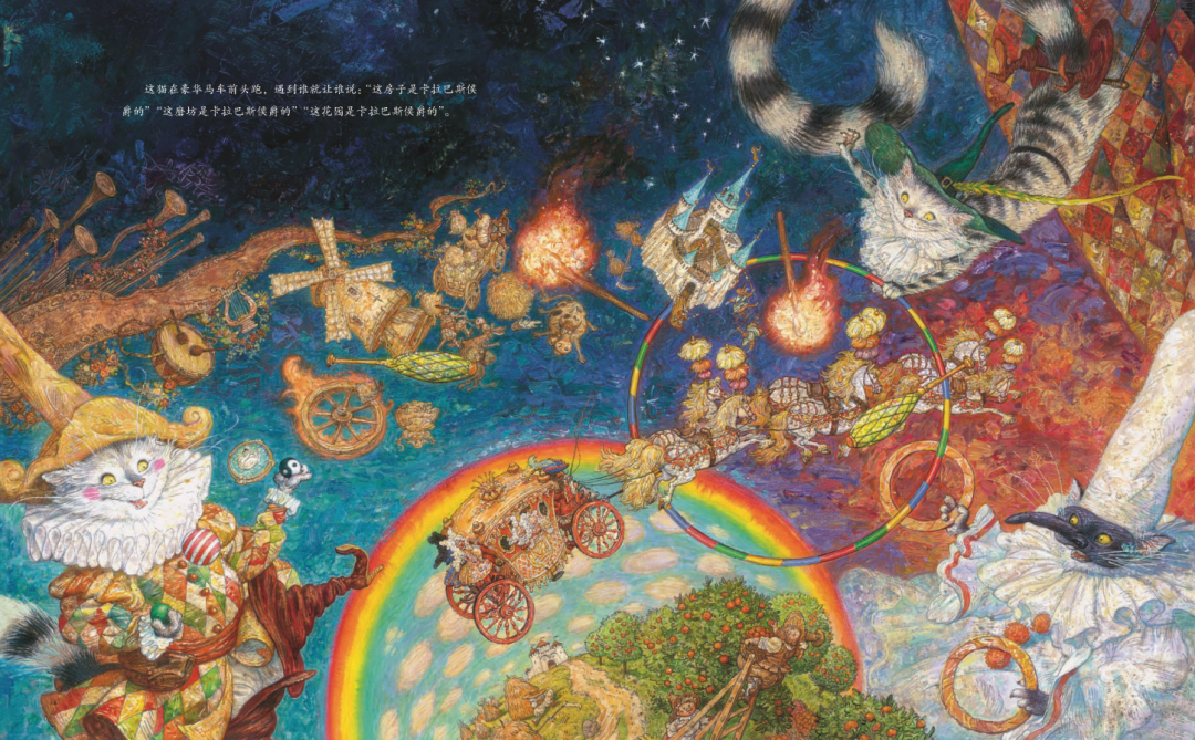 《穿靴子的猫》用带有漫画的手法去创作,颜色丰富、夸张,很像印象派的风格,让人惊叹于他的想象力。