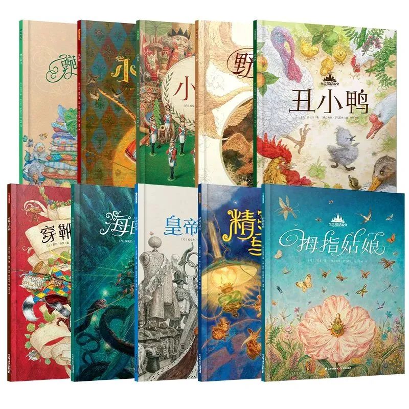 这十部经典童话,分别是《皇帝的新装》《海的女儿》《野天鹅》《穿靴子的猫》《丑小鸭》《小红帽》《豌豆公主》《小锡兵》《精灵与鞋匠》《拇指姑娘》。