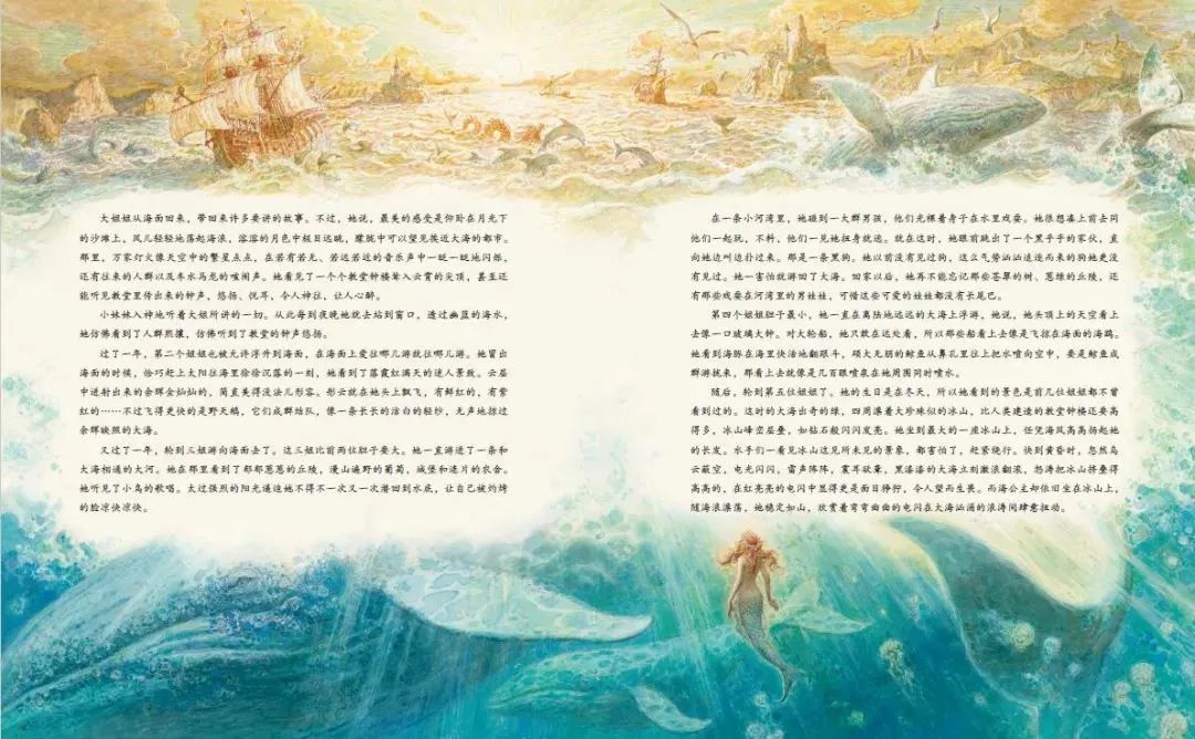 比如《海的女儿》整本书用大场景与特写相配合,用油画的笔法去画,造型写实,色调安静、古典。