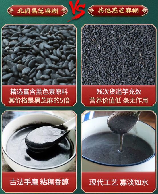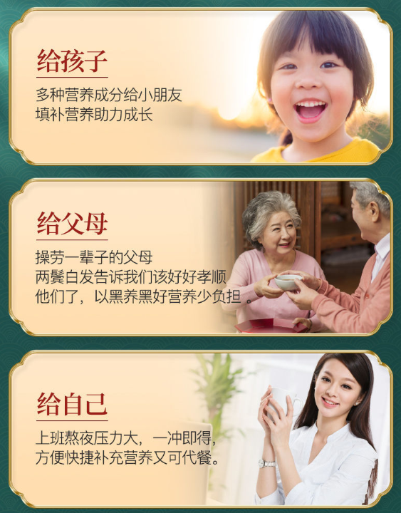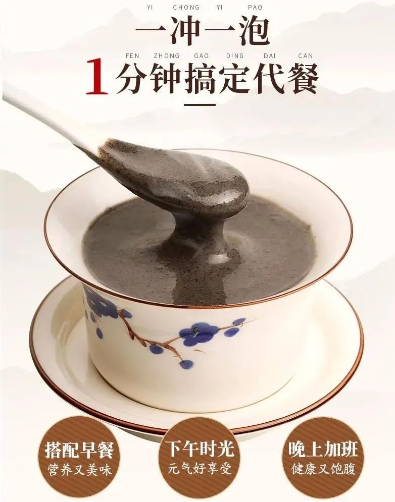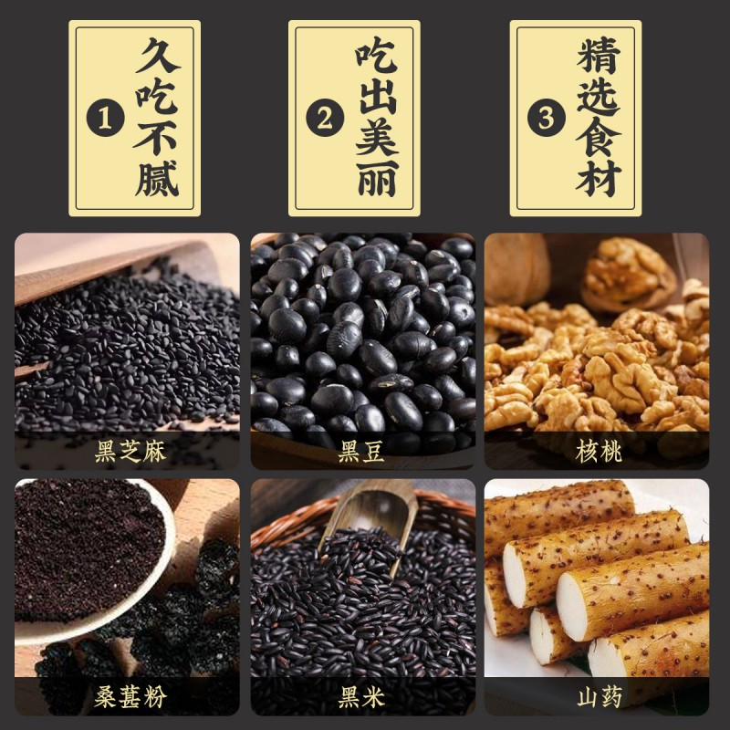 在黑芝麻的基础上还加入核桃、桑葚、黑豆等,粉状营养更容易吸收,是真正的养生食补圣品!