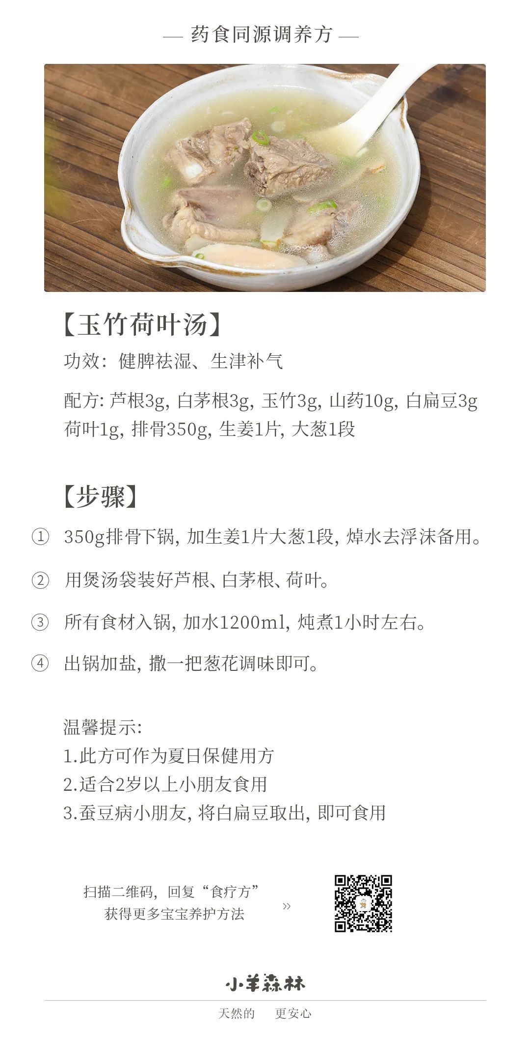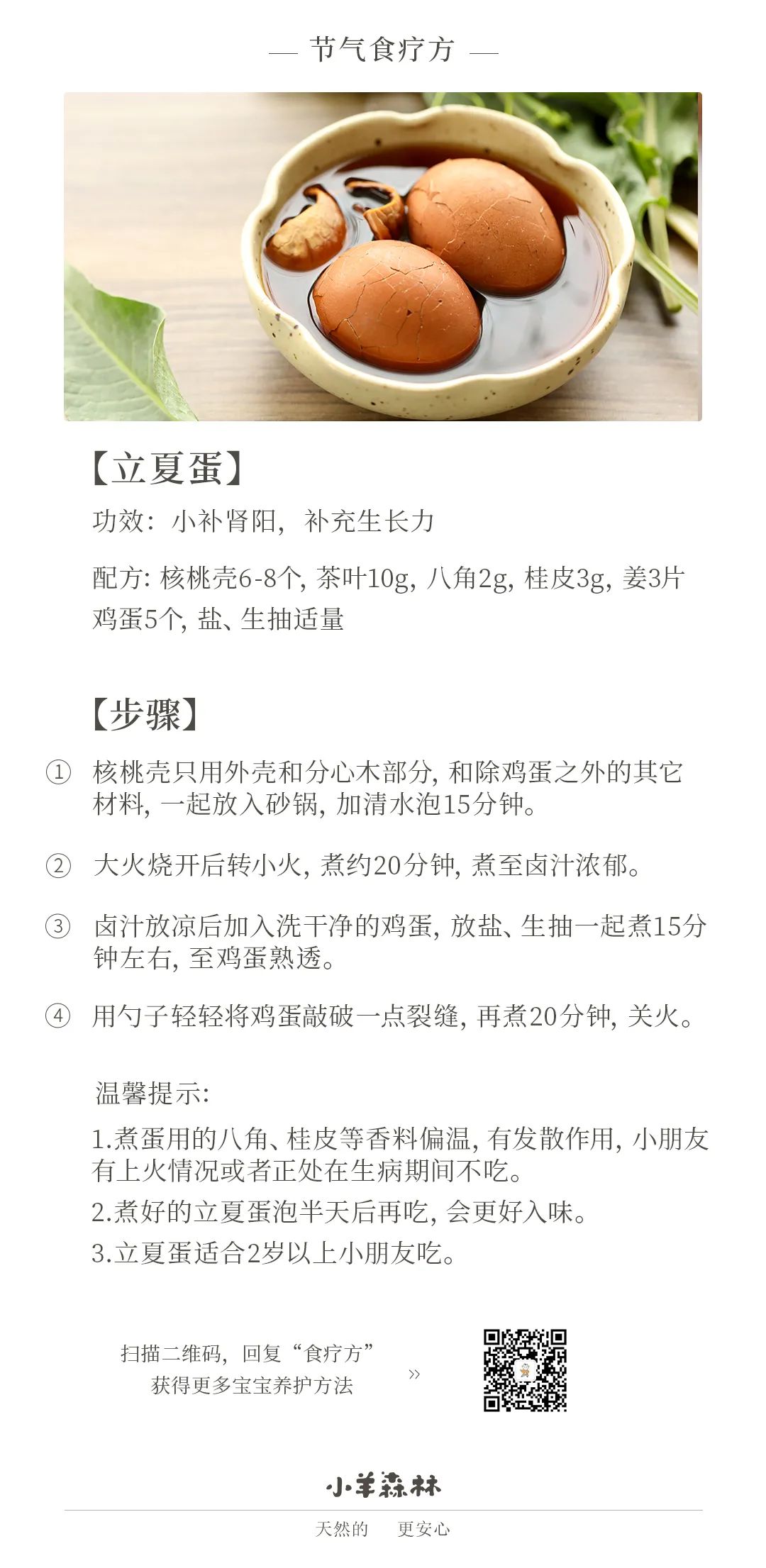 最近这几天,能明显感觉到天气热了好多,放眼望去,已经没有人穿长袖了。走在外面,会发现正午的阳光开始变得炙热,身体比前段时间更容易出汗,稍微走快点,还会有些累的喘不上气。所以立夏是夏天的缩影,整个夏天的问题在立夏都能感知到。妈妈在养护宝宝身体方面主要有下面这3个方向。夏天的暑热是最能耗伤身体阳气的,中医里有一句话叫“壮火食气”,大晴天,气温高,就是壮火,烧太旺就把体内的气消耗掉了。立夏的暑热已经有耗气的迹象了,细心的妈妈会发现,宝宝到了下午,浑身懒洋洋的,提不起精神气,总是想要被抱着。这个时候,就需要给宝宝补充被消耗的元气了。夏天的“火”不仅耗气,还非常损耗宝宝身体的津液。身体会很容易流汗,稍微运动下,后背的衣服就有了汗迹。适当的出汗可以帮助皮肤散热,但如果宝宝出汗很多,还老是感觉口干舌燥,想要不停喝水,就说明身体的津液已经亏损,需要给身体补充津液了。立夏一到,全年中湿气最盛的时候就在慢慢逼近了,天气又热,湿气很容易钻进宝宝体内,把脾胃捆绑起来,导致宝宝的消化能力直接下降。加上夏天的气血是往四肢体表走的,宝宝脾胃的能量本身就不够用,就容易对吃东西提不起兴趣,没什么胃口,需要妈妈帮助宝宝健脾祛湿才行。立夏时,夏天容易出现的问题都开始显现,但还没有那么明显,这个时候抓住机会给小朋友稍微清一清,补一补,效果是立竿见影的。这次给小朋友准备的是一个夏日基础方,它的各方面作用都比较均衡,夏天的常见问题都能兼顾到,既能健脾祛湿,还能生津补气。就像是个学生,各个学科成绩比较平均,不像一个偏科生,语文90,数学只有40,偏的厉害,所以补起来比较平和,宝宝整个夏天都能喝。夏天本就是一个耗气的季节,容易感到累,山药补气正好可以把耗损的元气补回来,增添身体的动力。给宝宝祛湿首选白扁豆,化湿而不燥烈,温和也不凉胃。夏天的湿气重是一年四季出了名的,这个时候要想祛湿效果好,用生的白扁豆才好。芦根和白茅根负责生津润燥,它们都是植物的根茎,补水效果很好,夏天身体流汗损失掉的津液就是靠它们补回来的。 玉竹养阴,相当于去到了源头补水,夏天老是觉得口渴,喝再多水都不解渴,这个时候使用玉竹就很有用。最后再搭配一点荷叶解暑祛湿,把夏天的烦热,和湿气困身的懒洋洋,一起散去。这个夏日基础方,吃法很多样,既可以煲排骨汤作为正餐吃,也可以添加绿豆当做宝宝两餐间的小甜汤,如果妈妈嫌麻烦,直接煮水也是没有问题的。玉竹荷叶汤煮出来的汤汁喝起来很清爽,一点也不滋腻,直接煮水,还能闻到淡淡的荷叶清香,好吃还能清补身体,让宝宝活泼泼地度过整个夏天。夏天是一年的“长”季,立夏开始人与万物一样加速生长,但小朋友在暑热天往往会没有胃口吃饭,还容易掉肉。这个时候就需要妈妈给宝宝小补一下“长力”,才有力量去蓬勃生长。肾主生长发育,补长力,其实就是给宝宝补肾阳。很多地方都有用核桃壳煮立夏蛋的习俗。我一直以为只是调味……学了中医后,才知道核桃分心木,是一味健脾固肾的中药。《本草再新》里载:分心木性质平和,健脾固肾,可以固涩肾精,还可以活血、补血。日常煮水、泡水喝都很不错。作为小补的立夏蛋,只用核桃壳和分心木,借它一点点力,不同于冬日里的温补,会把核桃芝麻吃进去,所以妈妈不用担心宝宝会上火。除此之外,煮蛋的水里还加了茶叶升清降浊,桂皮和八角温阳,几片生姜来驱寒,很适合夏天外热内寒、有气无力、又没食欲的小朋友。另外这次我们还做了一整套夏季养护指南,里面一共有10张卡片,是我们根据夏季的节气特点,由小羊森林专业中医老师搭配的夏季养护食疗方。里面有小朋友没胃口吃饭时,帮助开胃的椰子清补凉;当宝宝感觉潮湿烦闷时,帮助清利湿热的陈皮红豆沙;还有帮助宝宝养心安神的莲子清心汤……关于夏天如何呵护宝宝的健康,妈妈在这里,都可以找到答案。玉竹荷叶汤,这次我们也挑选了品质好的食材,搭成了汤料包。如果妈妈担心找不到好的药食材,可以点击上方图片购买,还可以获赠一整套【夏季养护指南】卡片。再过几天就是母亲节了,今年也为妈妈们准备了福利活动,进小铺就可以看到。希望在炎炎夏日里,妈妈自在舒心有爱,宝宝活力长高高。