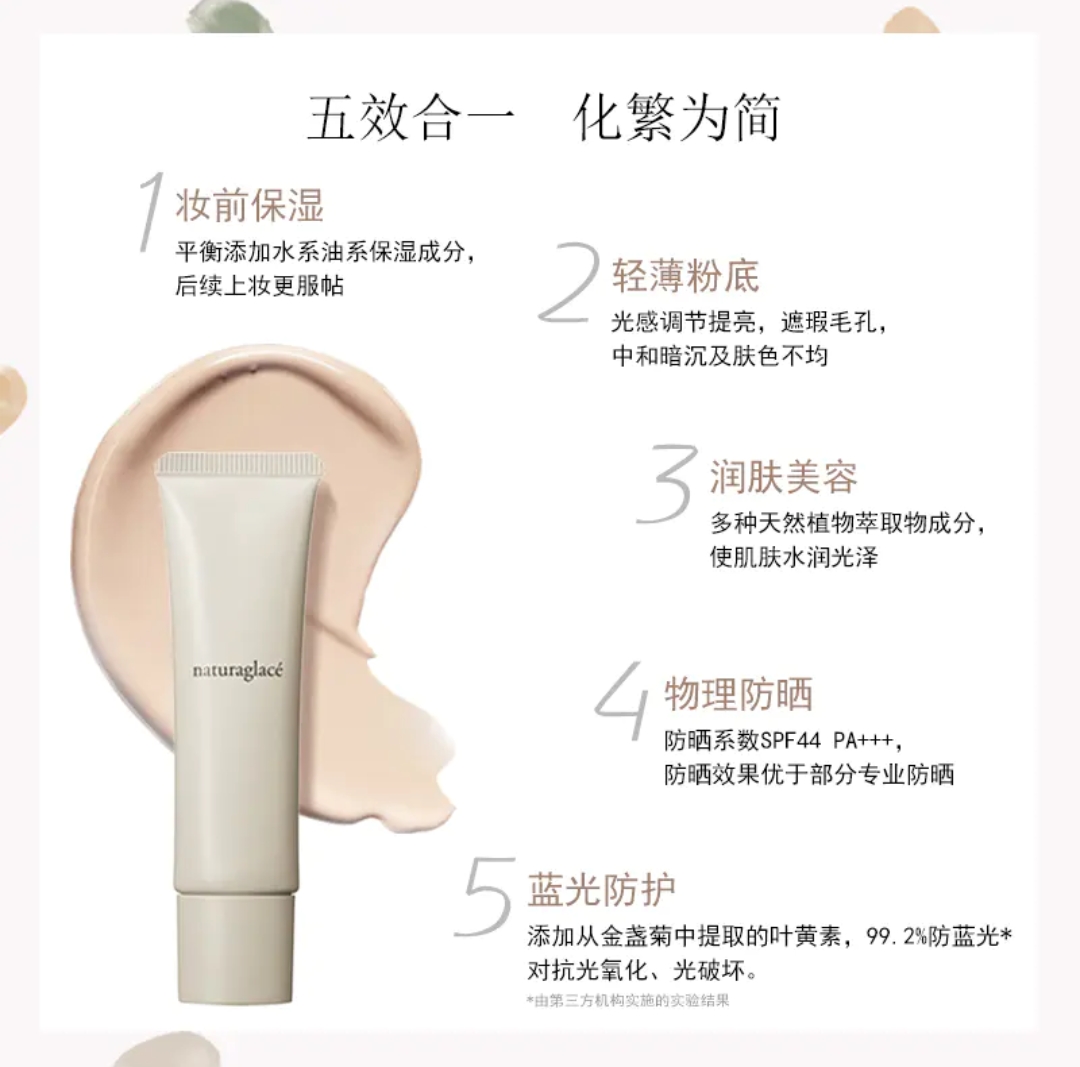 natureglace是取材天然的彩妆品牌:不伤肤不伤孕,妆前乳质地轻薄、五效合一、隔离辐射、粉尘、脏空气,不含致敏成分,孕期哺乳期、敏感肌都可用。