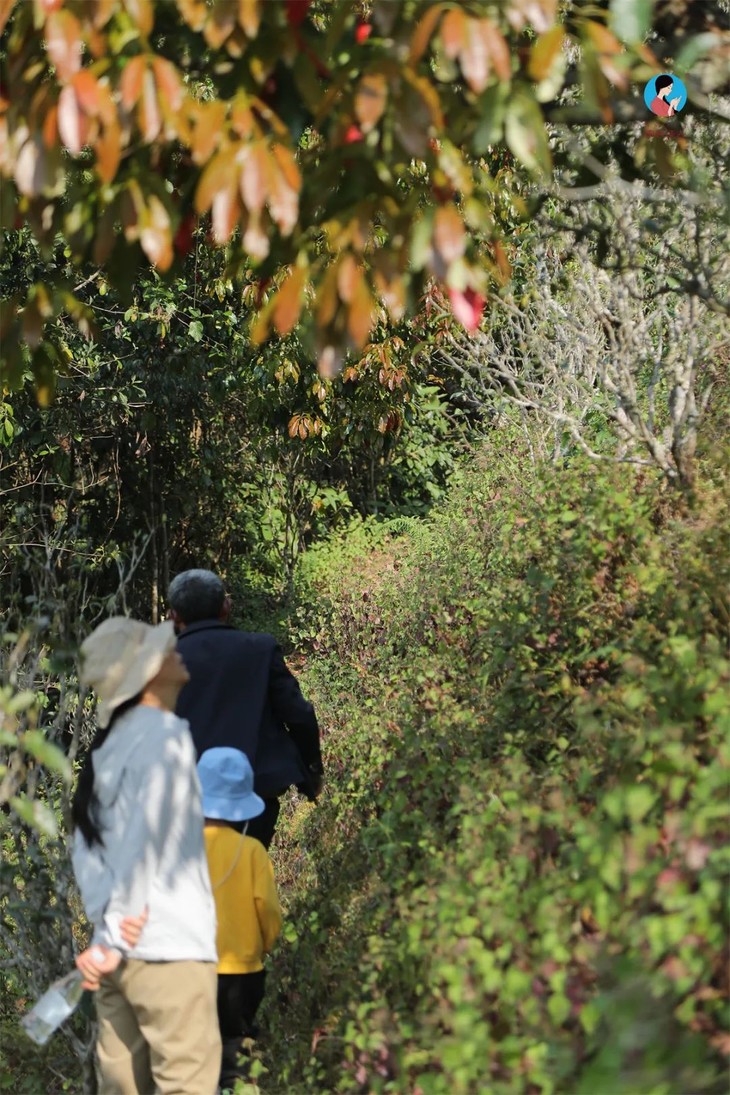 从山脚到山顶,皆上坡,途中偶遇农人归家,相邀家中加餐饭,还未至茶园,遂谢绝。