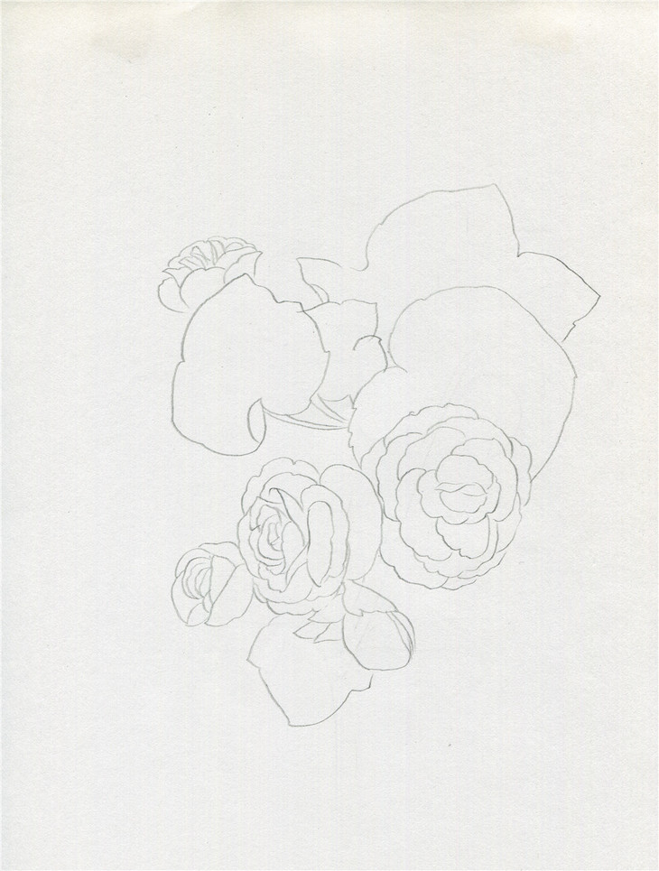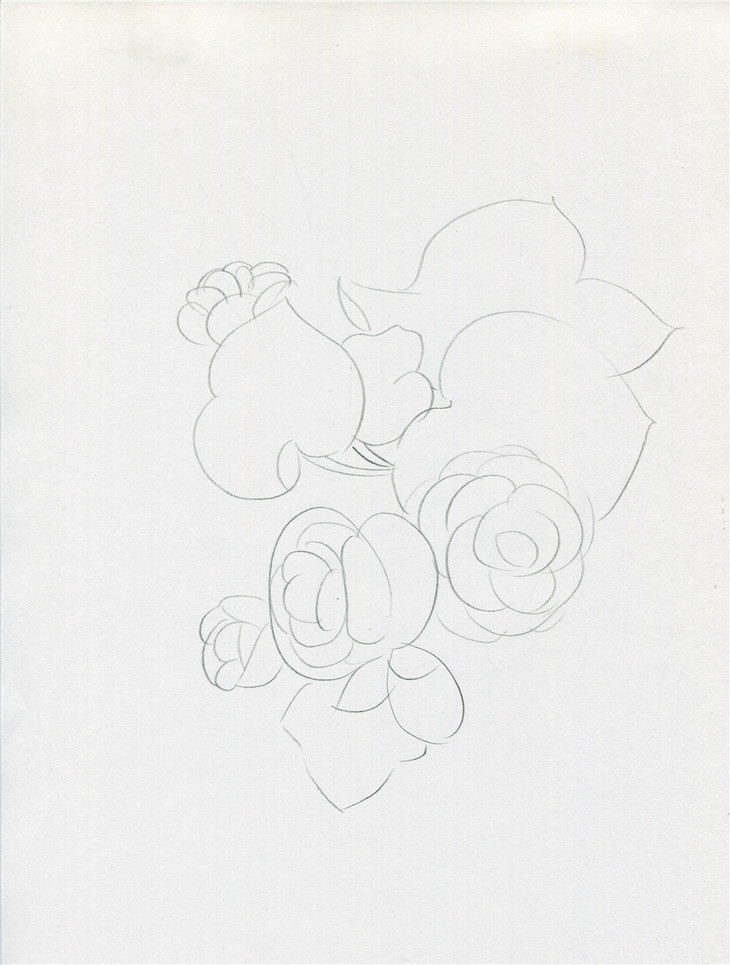 首先用铅笔定出花和枝叶的大概位置,注意构图,主体花尽量定在纸的中心部位,用笔要轻,因为这些辅助线最后要擦掉,保持画面整洁。