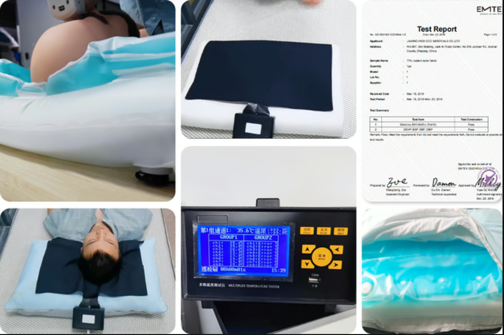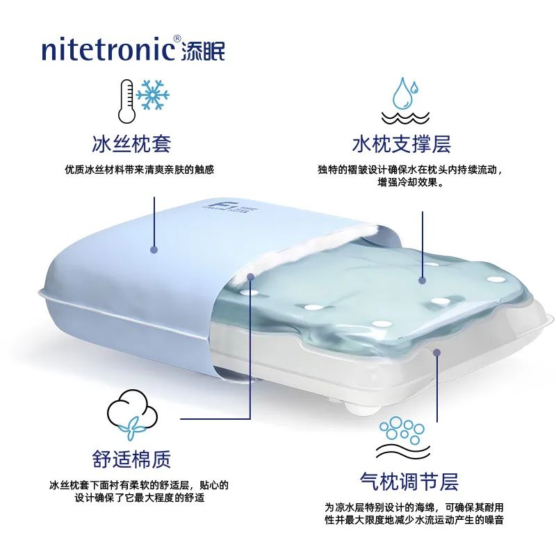 除了枕头内的冷却水,它配备了锦氨冰丝冷却罩。