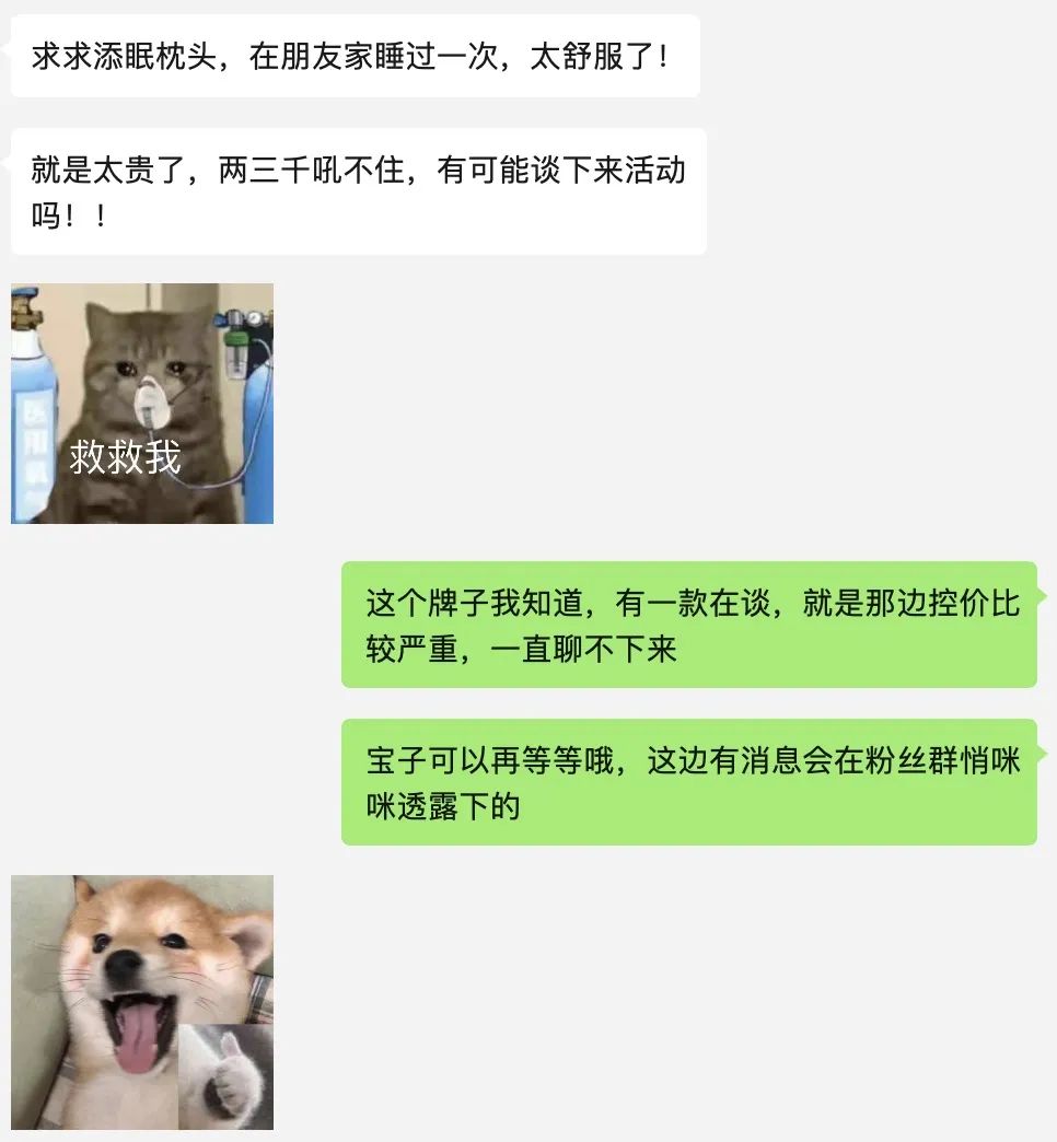 不少粉丝也来问我们有没有添眠枕头的活动,因为品牌控价严格,价格迟迟没有谈下来。