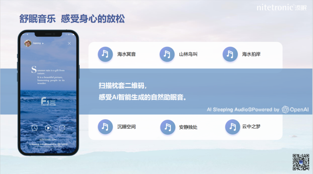 不仅如此,添眠还与与Open AI合作,我们的枕头可以根据水流声、水滴声、心率、天气和地区参数生成独特的声音。