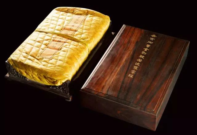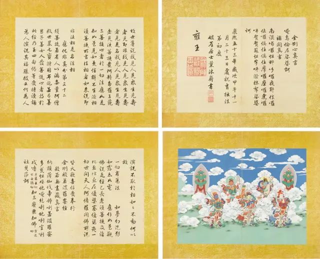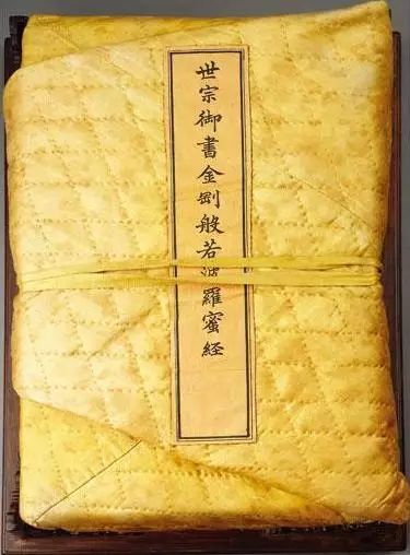 这册《金刚经》,装裱为清代宫廷样式,共有3层包装。最外面是一个红木匣子,上书金字“世宗御笔金刚般若波罗蜜经”,接下来是一个明黄色的布包,然后打开一个纸盒才能见到经书。翻过经书第一页的工笔重彩佛画后才是正文,上面有“康熙五十三年、破尘居士沐浴斋书、雍王”字样和红色印章。经书37开册页每页有7行字,每行约12字。