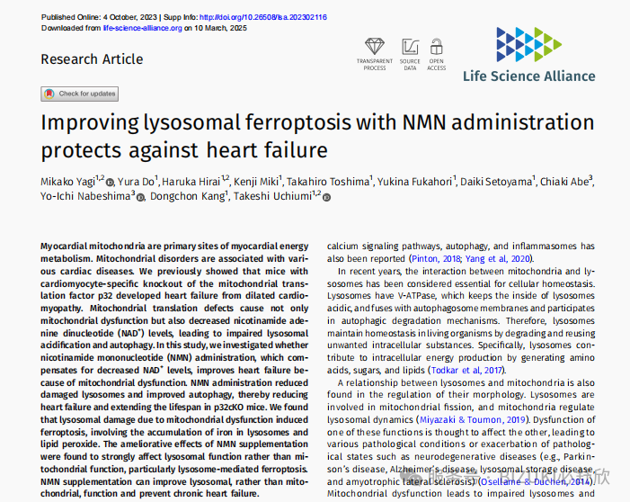 改善心脏功能:长期补充NMN可以显著改善心力衰竭小鼠的心脏功能,并延长其寿命。 修复线粒体损伤:NMN能够修复心肌细胞中的线粒体损伤,提升心脏的抗氧化能力。 减轻心肌纤维化:NMN通过调节NAD+水平,减轻心肌纤维化,改善心脏结构。