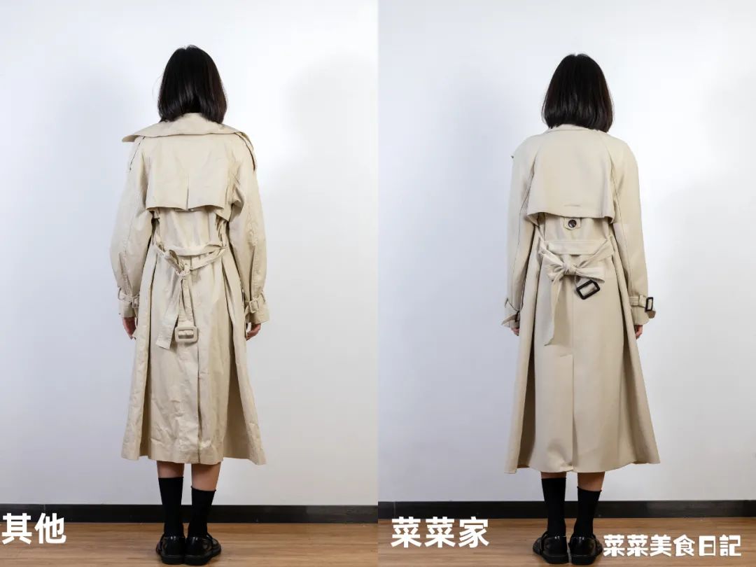 当把腰带系紧的时候,这一块雨罩才会发挥作用,可以防止雨水顺着衣服流遍全身。 背面走线和版型也比较挺括,要是一扎腰带,也更能凸显腰肢的纤细。