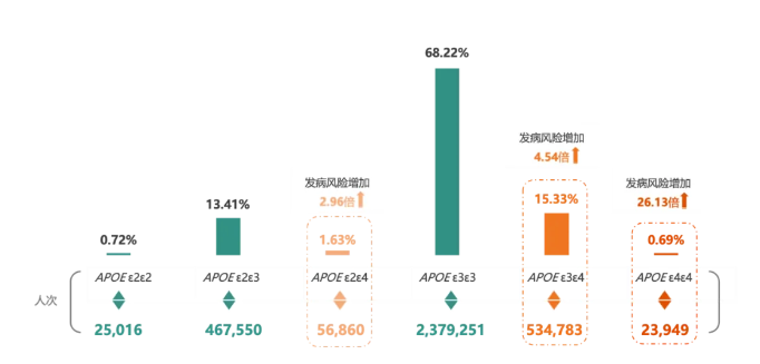 多年前,爱康便聚焦AD的早筛早诊,在行业中率先布局适用于AD早期筛查的前沿技术与手段。报告统计数据显示:截至2023年12月,爱康集团联合南方基因已开展约349万人次的APOE 基因检测。携带APOE ε4等位基因(阿尔茨海默病高风险基因型)的占比为17.65%。其中,携带APOE ε3ε4人次数较多,占比超过15%,该人群发病风险增加4.54倍。