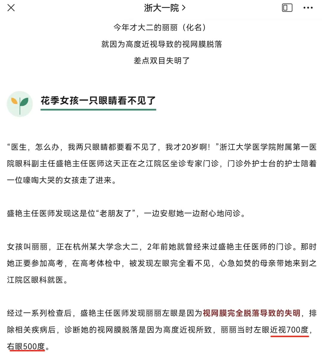 如果你去眼科医院眼底专科的术后病房转一转,看看那些走路、吃饭、睡觉都得低着头的高度近视患者,相信你就再也不会说出“不就是个近视吗,戴眼镜就行”这样无知的话。