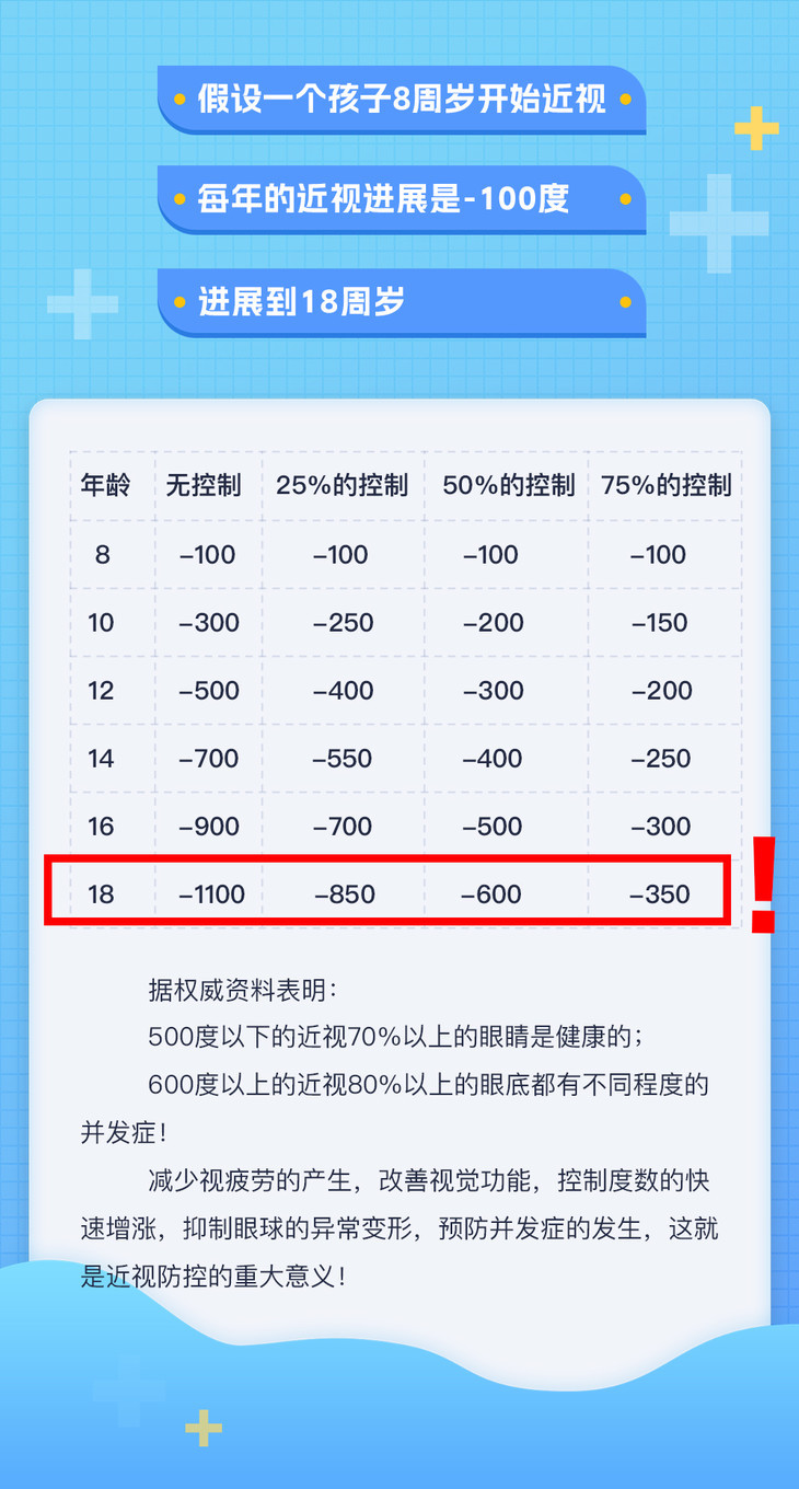 假设一个孩子8岁时就患有100度的近视,如果完全不防控、不干预,那么大概率将会以每年75~100度的速率上升,到孩子18岁的时候,可能达到800~1000度的近视。即便采取了一些措施,控制25%的增速,那么也会在850度左右。