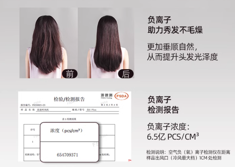 同样无叶中空设计,防止夹头发的同时,更大的风让头发中的水分蒸发速度变得更快 11万转超高速马达,3分钟吹干长发 6.5 亿负离子/cm³,自动养发 越吹越柔顺