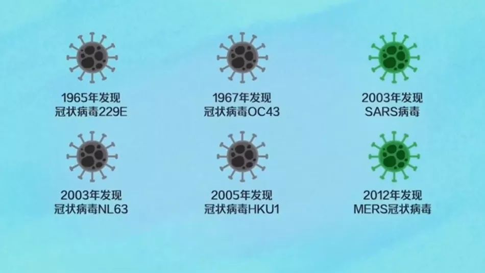 目前已知的冠状病毒有6种,常见的有4种,致病性较低,仅会引起普通感冒,而另外2种SASR(引发非典)、MERS(引发中东呼吸综合征)可引起严重的呼吸系统疾病,本次发现的第7种新型冠状病毒就属于后者,通常有5~10天的潜伏期,目前还没有确切有效的药物治疗。