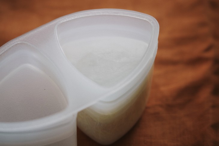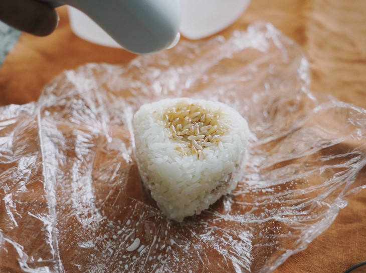 2、保鲜膜上放一些米饭然后放一勺混合好的金枪鱼酱,然后再放一些米饭,用手或者模具整成三角形
