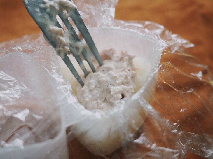 1、将金枪鱼罐头捣碎和沙拉酱混合在一起,调味酱料也混合到一起