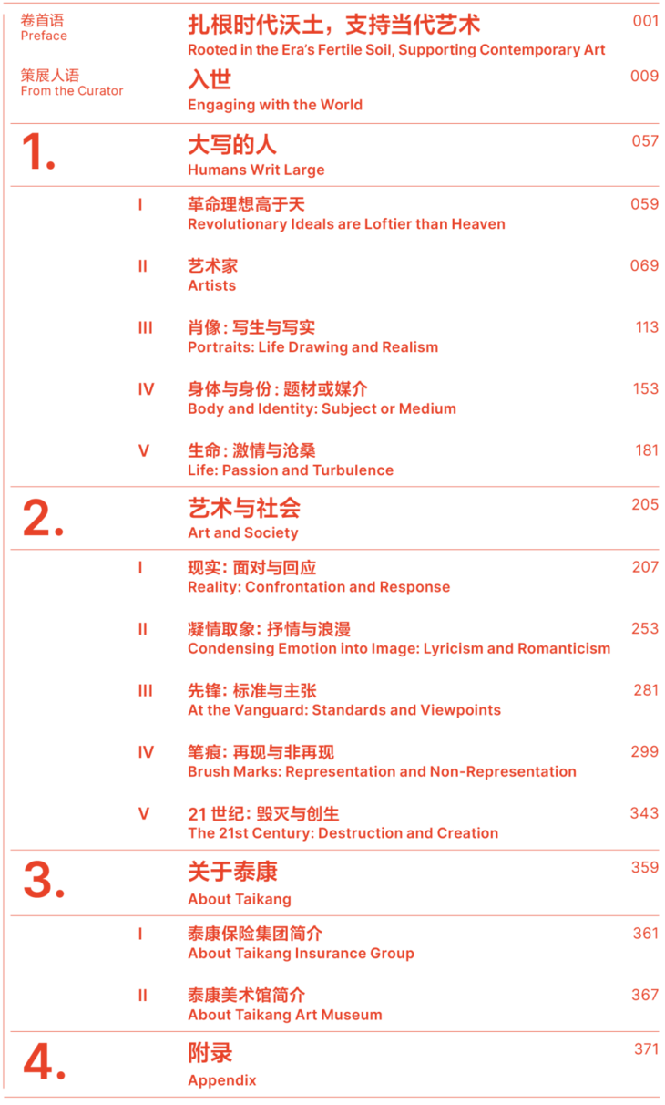 除卷首语与策展人专论之外,泰康美术馆研究团队还撰写了各单元的主题文章。全书收录百件艺术展品,并附有详细的作品解读。