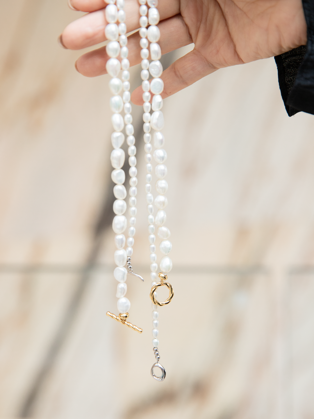 Eloane Gallery的巴洛克珍珠锁骨链是我的一眼心动!分别有两个款式:银扣款的米粒珍珠直径约4-5cm,长度约41cm,更加秀气雅致,适合通勤;金扣款珍珠直径约8-9cm,长度约42cm,更加复古时髦,适合想打造风格的时髦人士~ 这两条巴洛克珍珠项链我拿到手的第一印象就是质感好。