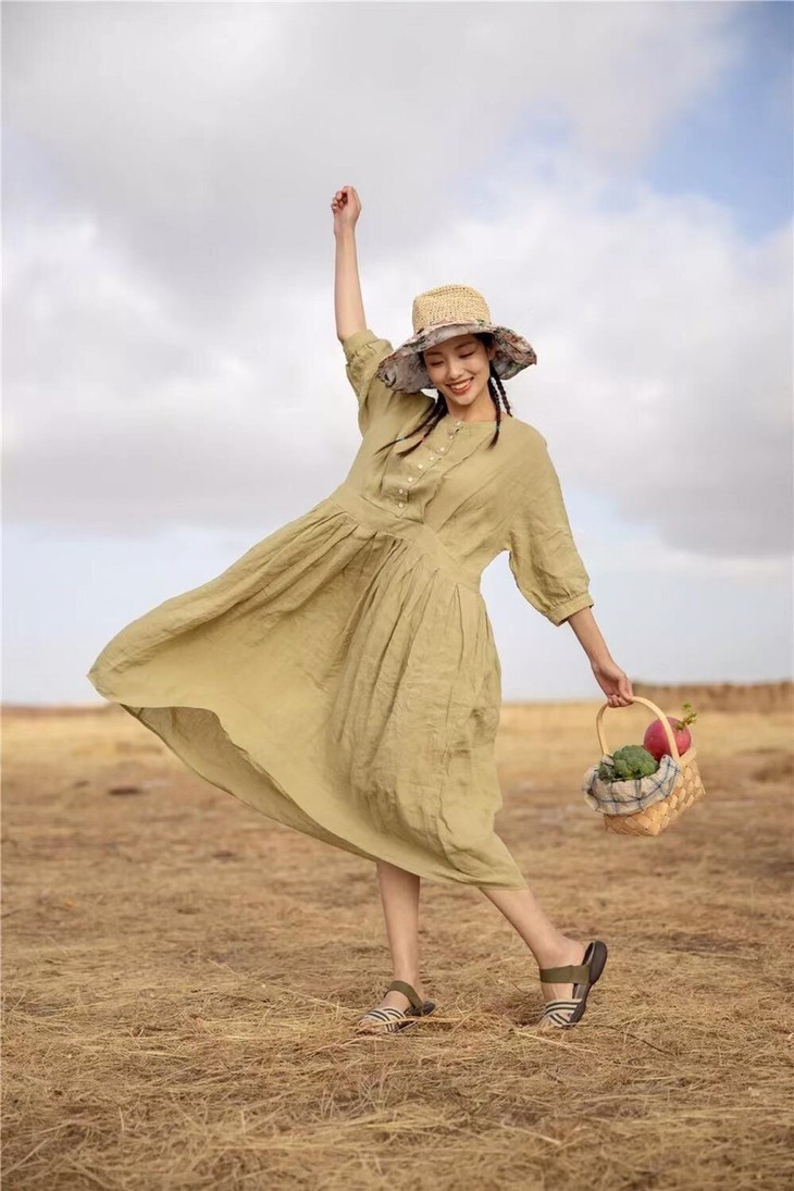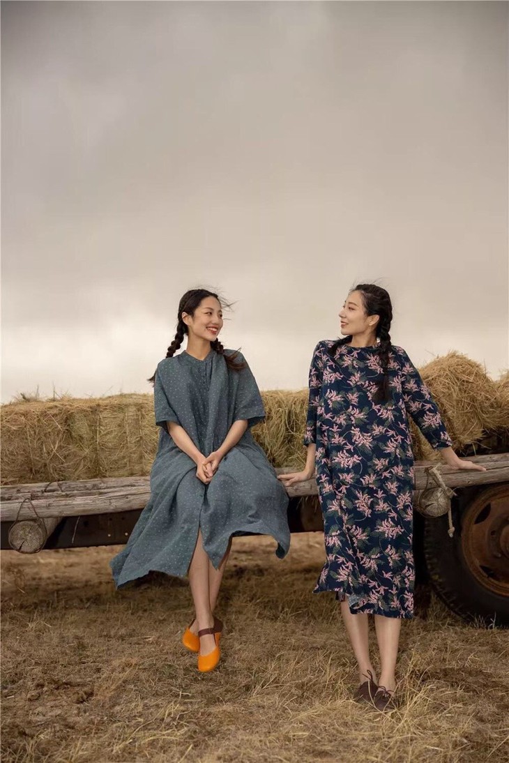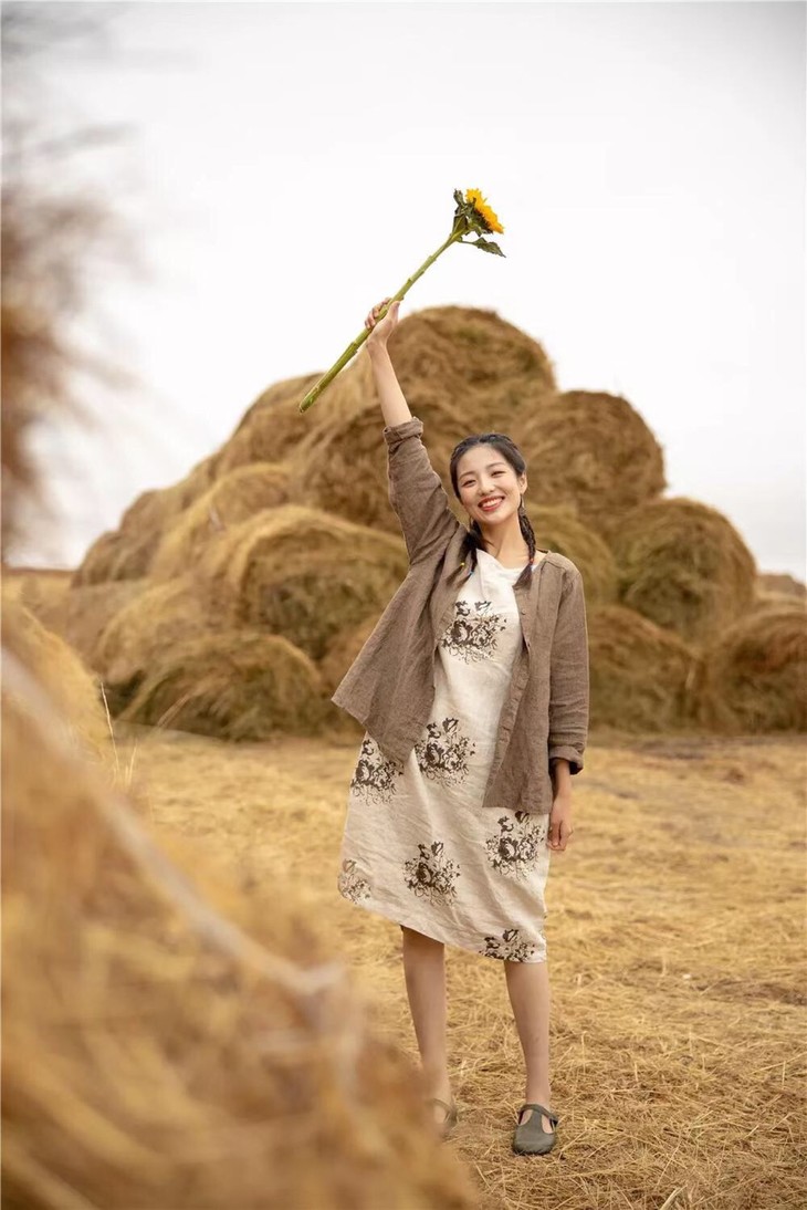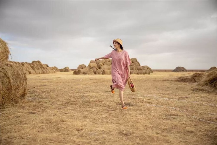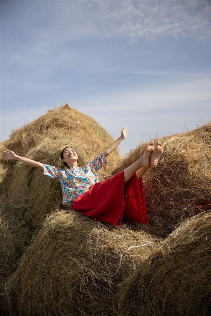 下午的斜阳铺洒下来,给画面打上一层暖光,草垛、长桌、穿着民族服饰的俄罗斯族女人、绽放的亚麻裙摆。
