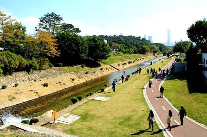都市绿洲的宁静。福田河绿道是徒步和骑行的好路径,全长六公里左右,沿线波光潋滟,草木茏葱,鸟语花香,河岸风景优美。