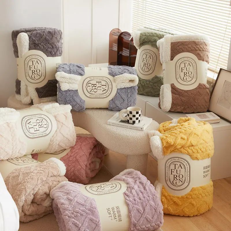 冬日温暖必须有他,塔芙绒羊羔绒毛毯,优雅香风菱格花纹,多种低饱和度暖色可选,大朵羊羔绒加厚面料,双层保温加倍暖呼,正面320g塔芙绒提花剪花工艺,反面230g定制素色,不掉毛,不起球,无静电,可机洗,一毯多用,暖一整个冬!