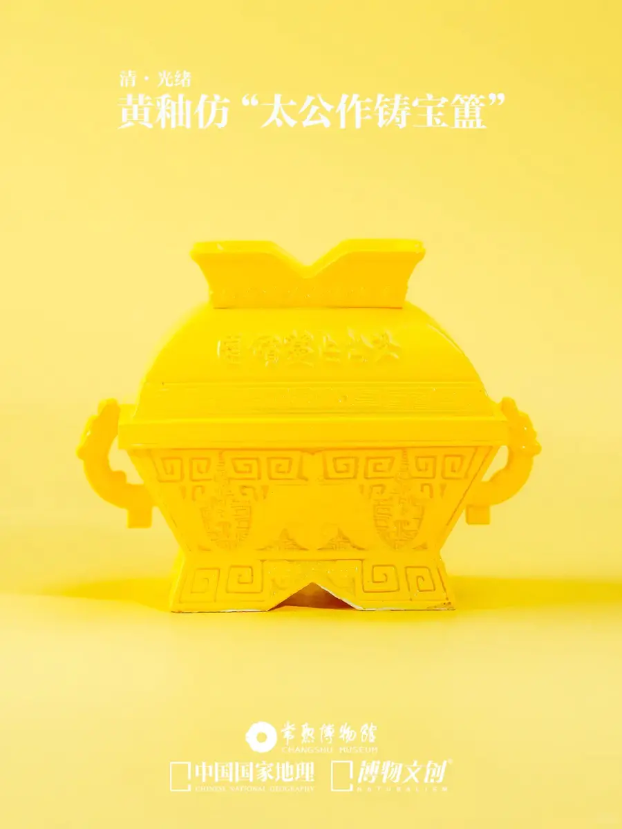 黄釉仿“太公作铸宝簠”器身遍施黄釉,器呈长方形,直口平唇,斜壁深腹,兽首双耳,方圈足。