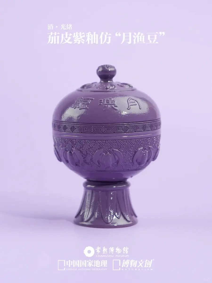 茄皮紫釉仿“月渔豆”器身通体施紫釉,子母口,柱形足。盖阳刻隶书“月渔豆”三字,口沿饰雷纹,圆钮顶刻团寿,钮下雕五只蝙蝠,寓意“五福捧寿”。