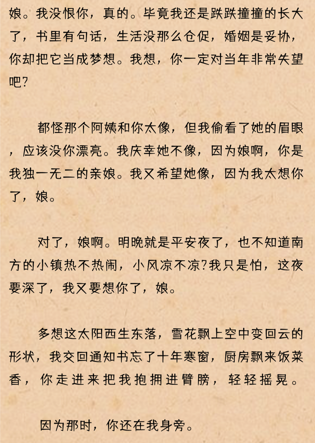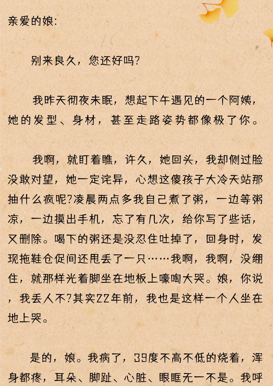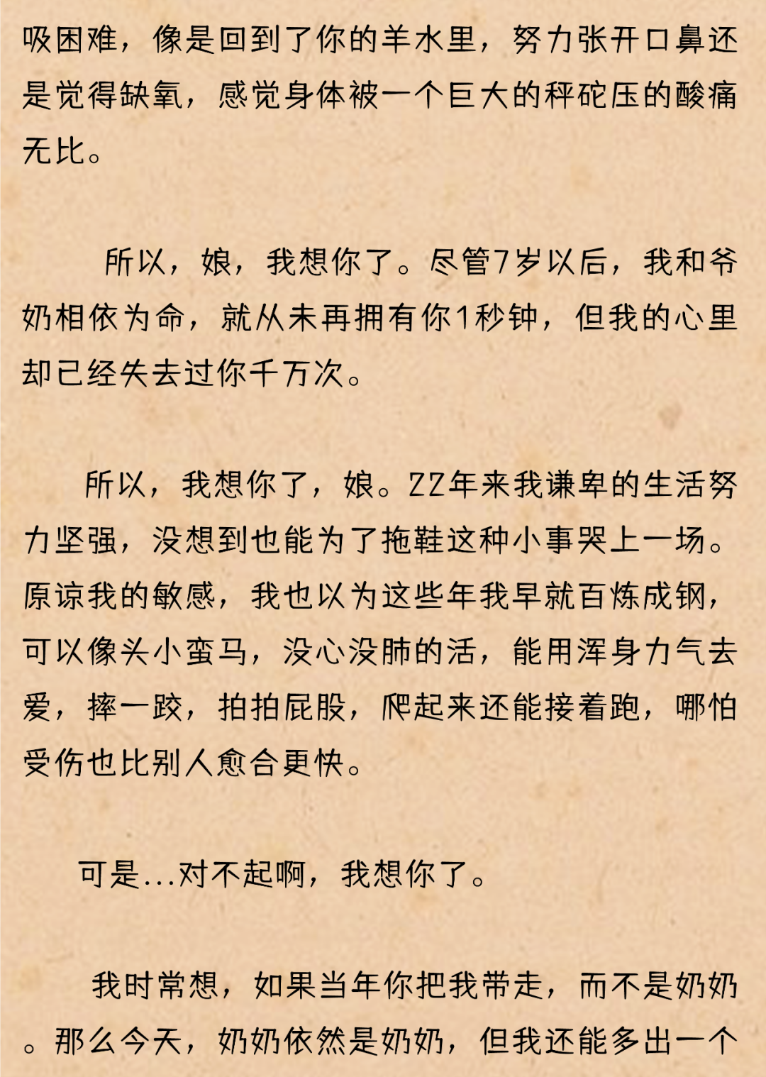 寥寥几百字,我虽不能真切体会到张姑娘的感受,但却会勾起我对妈妈的记忆,每次 读后都不禁泪崩,让我回想起90年代风靡大江南北的一部电影《妈妈再爱我一次》,那首经典的歌曲《世上只有妈妈好》再次回荡在我的耳旁: 世上只有妈妈好