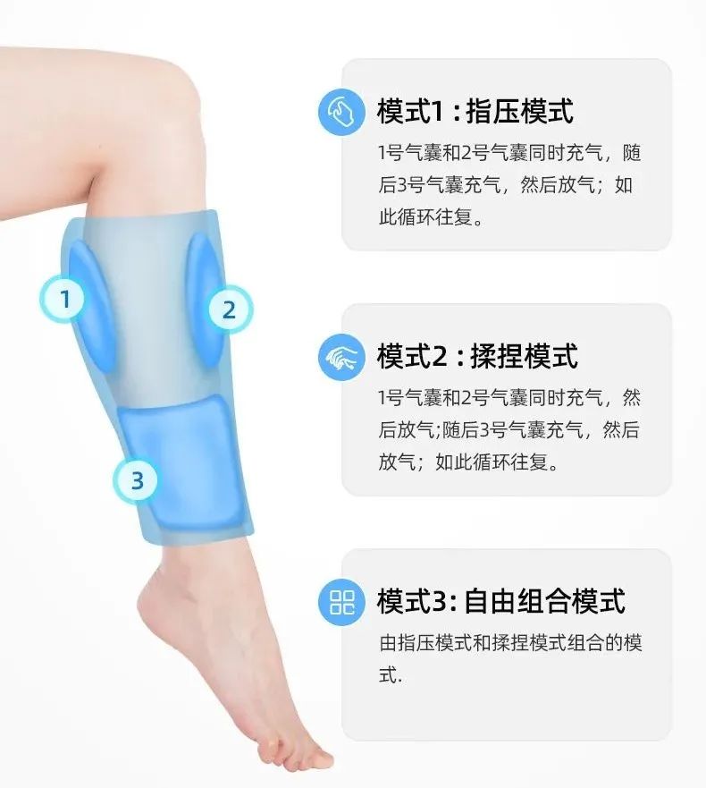 通过三个气囊工作顺序的不同,模仿人手揉捏、按压、提拉的感觉。