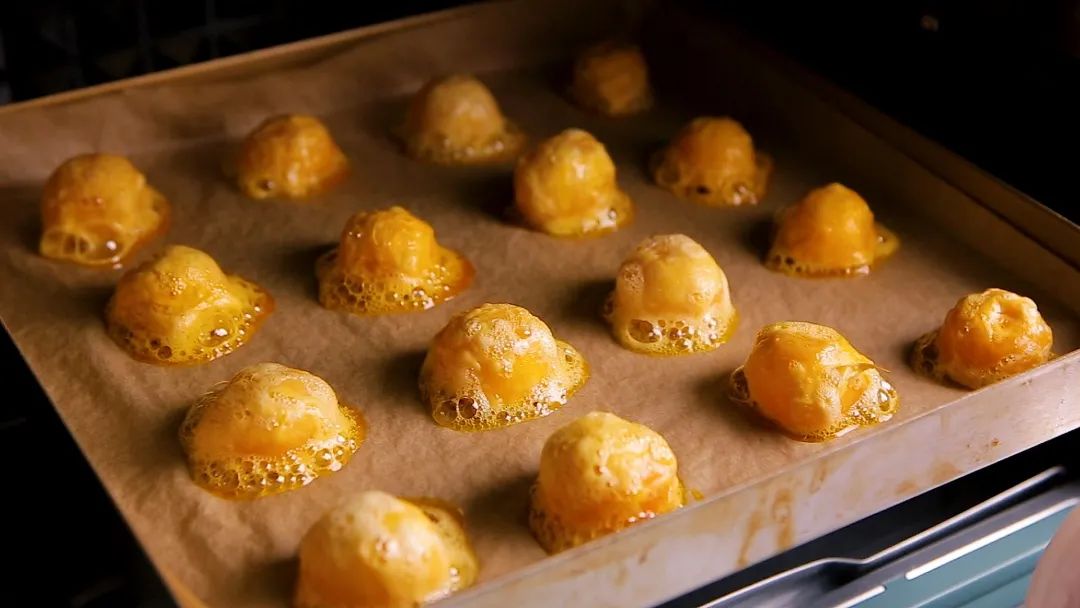 咸蛋黄喷酒烤焙,上下火190度烤7-10分钟,这样做出来的蛋黄酥才有流油的效果