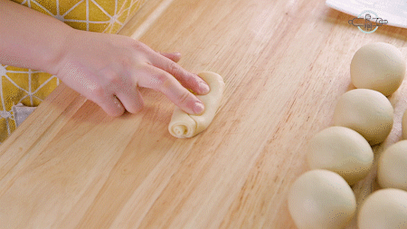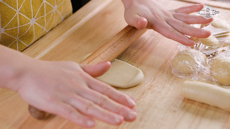 将松弛好的面团再次压扁,擀制牛舌状并卷起松弛20分钟
