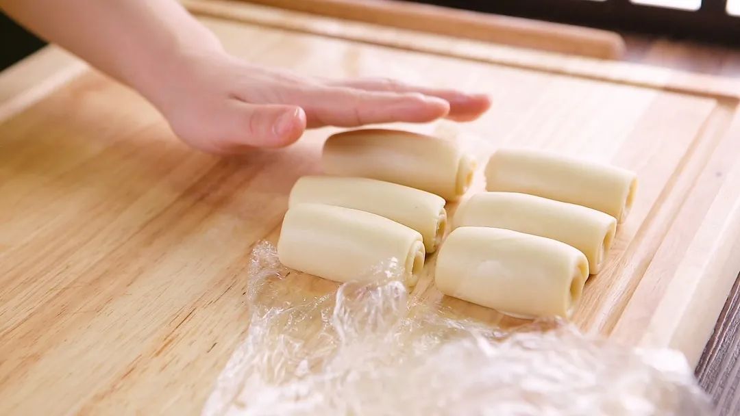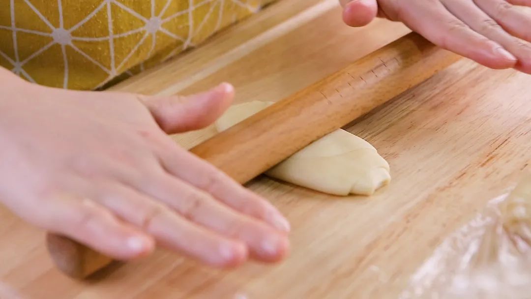擀制牛舌状,轻轻卷起,也不能太紧,太紧容易在擀至过程中破酥,然后盖保鲜膜松弛20分钟